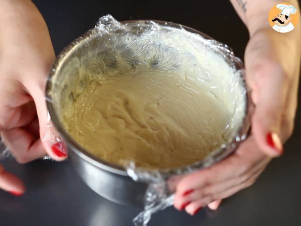 A questo punto togliete il pentolino dal fuoco e aggiungete il burro a pezzetti. Mescolate bene e coprite a contattato con la pellicola alimentare per evitare che si formi la crosticina, quindi lasciate raffreddare completamente.