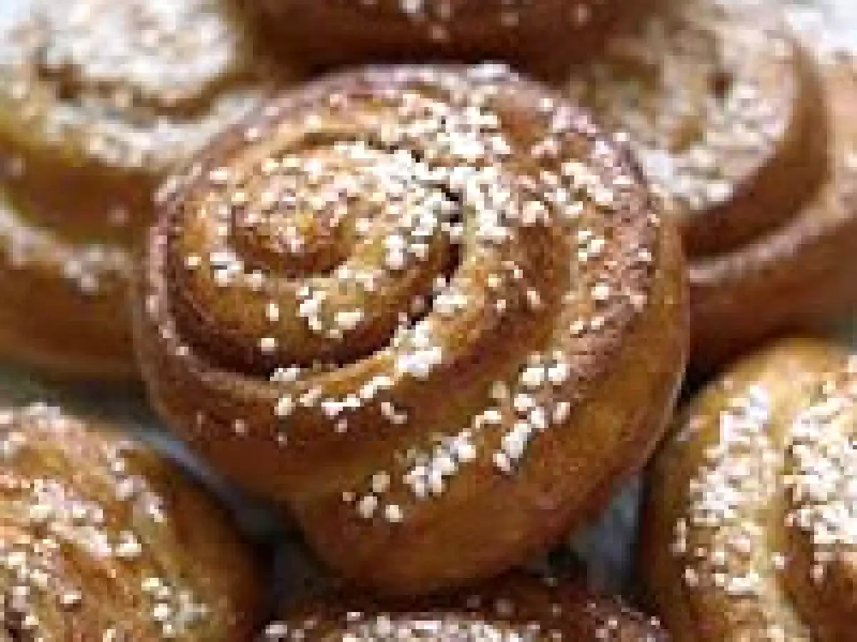 - Terminata la seconda lievitazione, scaldate il forno a 190°, cospargete le briochine di grannella di zucchero e infornate per 20 minuti circa, o finché le kanelbullar risulteranno dorate.