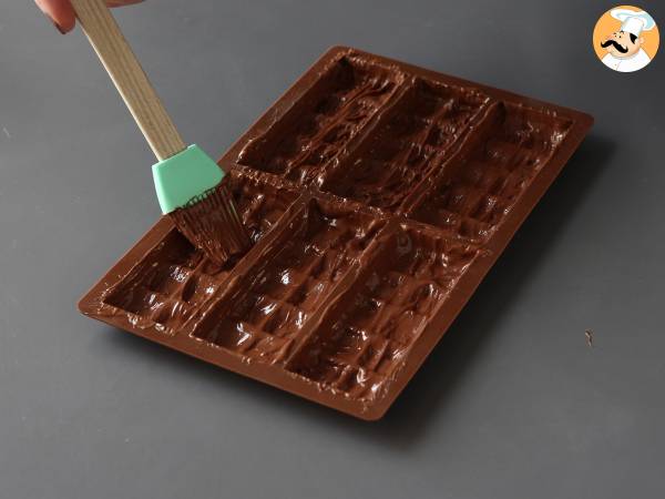 Sciogliete il cioccolato al latte e spennellatelo sul fondo degli alveoli dello stampo in silicone. Conservate in frigorifero per almeno 20 minuti.