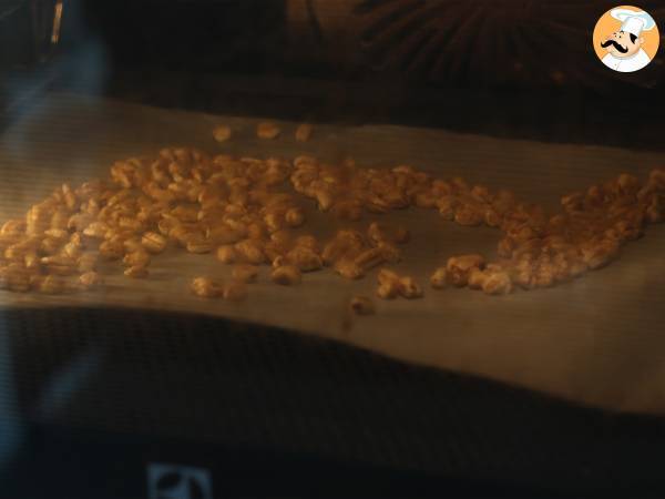 Versate i cereali soffiati su una teglia ricoperta con carta da forno e fateli dorare in forno per 10 minuti a 200°C.