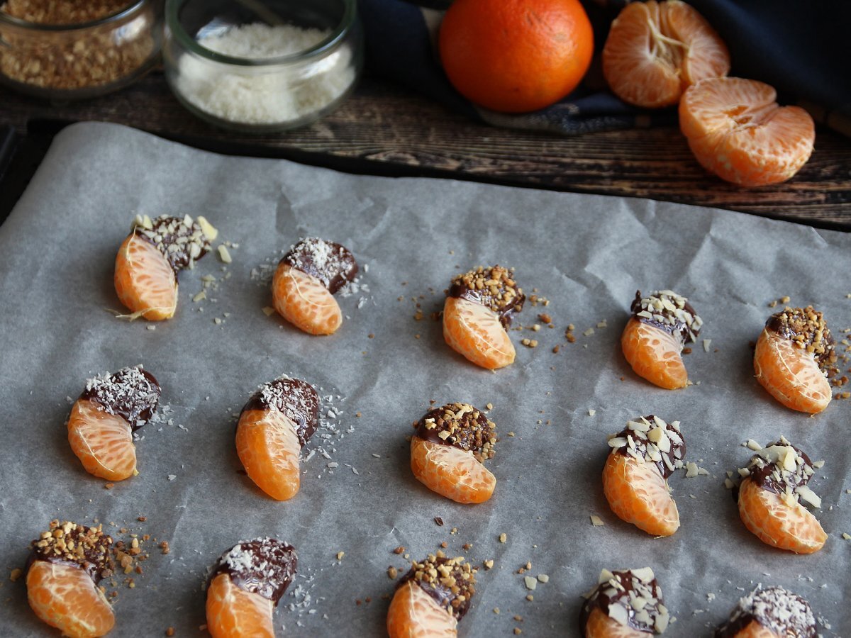 Allerta ricetta super semplice per uno spuntino goloso! Da una parte adoriamo la freschezza dei mandarini in inverno, dall'altra non possiamo fare a meno della delicatezza del cioccolato. Bene, abbiamo deciso di unire le due cose in una combinazione perfetta. Scopri come si preparano i mandarini al cioccolato e decorali con cocco grattugiato, granella di nocciole e lamelle di mandorle. Questa ricetta facilissima farà impazzire tutti, anche i più piccoli!