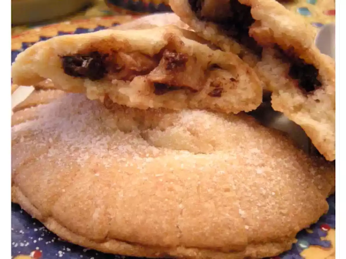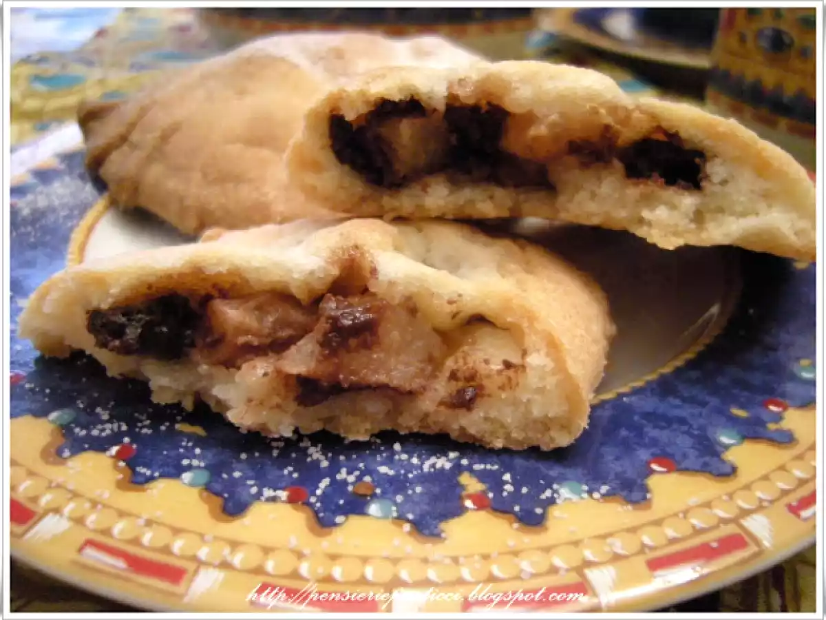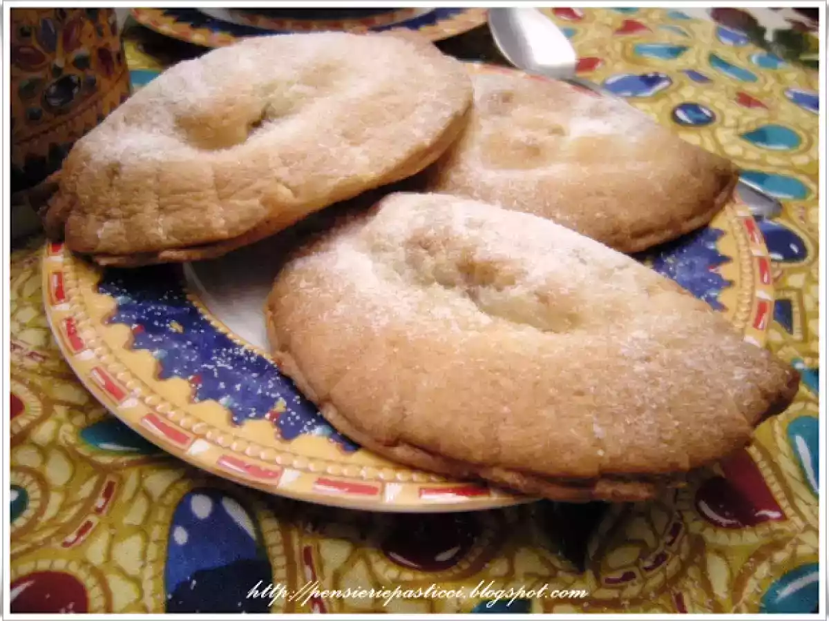 Mezzelune di frolla ripiene alle noci, cioccolato e pere PrecedenteProssimo Snackfacile50 min Invia questa ricetta ad un amico Stampa la ricetta Contatta l'autore della Ricetta Pubblica la foto di questa ricetta Ingredienti 3 per la pasta frolla: 300 g farina 00 80 g zucchero 130 g burro morbido 1 uovo intero ed 1 tuorlo Scorza di mezzo limone grattugiata molto finemente Mezzo cucchiaino di lievito vanigliato per dolci Per il ripieno: Una pera kaiser sbucciata e fatta a piccoli dadini Gherigli di noci spezzettate q.b Crema spalmabile alla nocciola