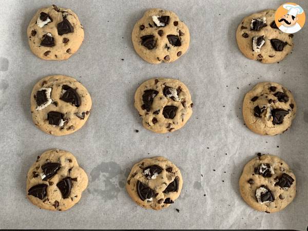 Aggiungete dei pezzi di Oreo e qualche goccia di cioccolato sulla superficie dei cookies appena usciti dal forno affinchè questi siano posizionati alla perfezione.