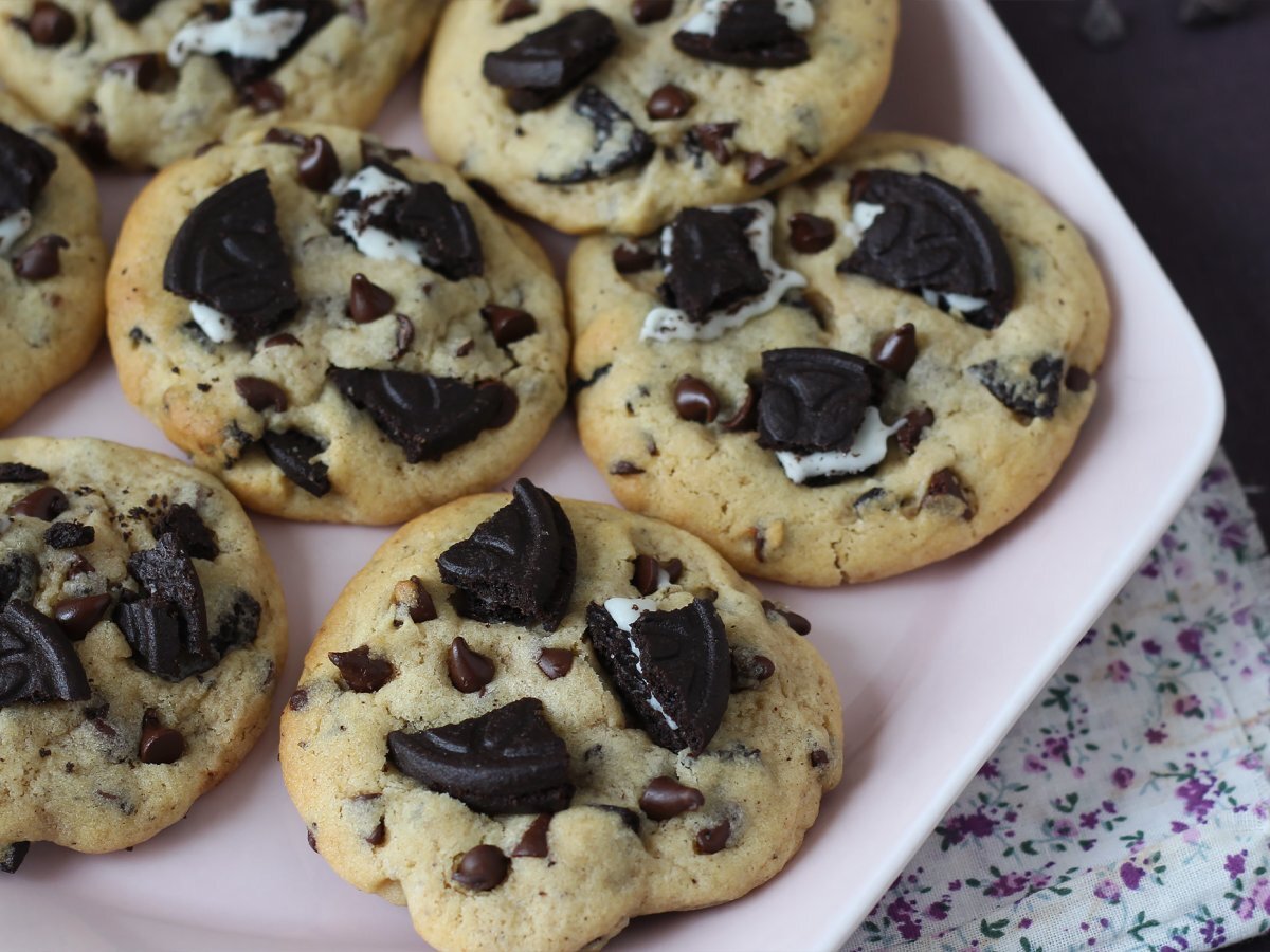Una volta sfornati, aggiungere dei pezzettini di Oreo sulla superficie dei cookies per renderli più gustosi.