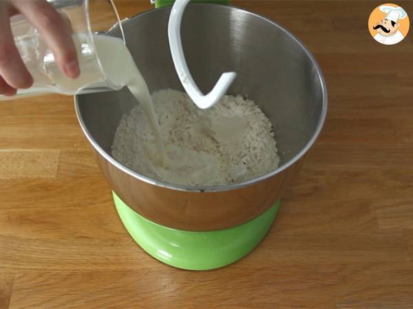 Mettete la farina, il sale e lo zucchero nella ciotola della planetaria. Quindi disponete a fontana. Aggiungete nel mezzo il lievito sminuzzato facendo attenzione a non farlo entrare in contatto con il sale. Versate nella ciotola anche l'acqua ed il latte, poi impastate a velocità media per qualche minuto.