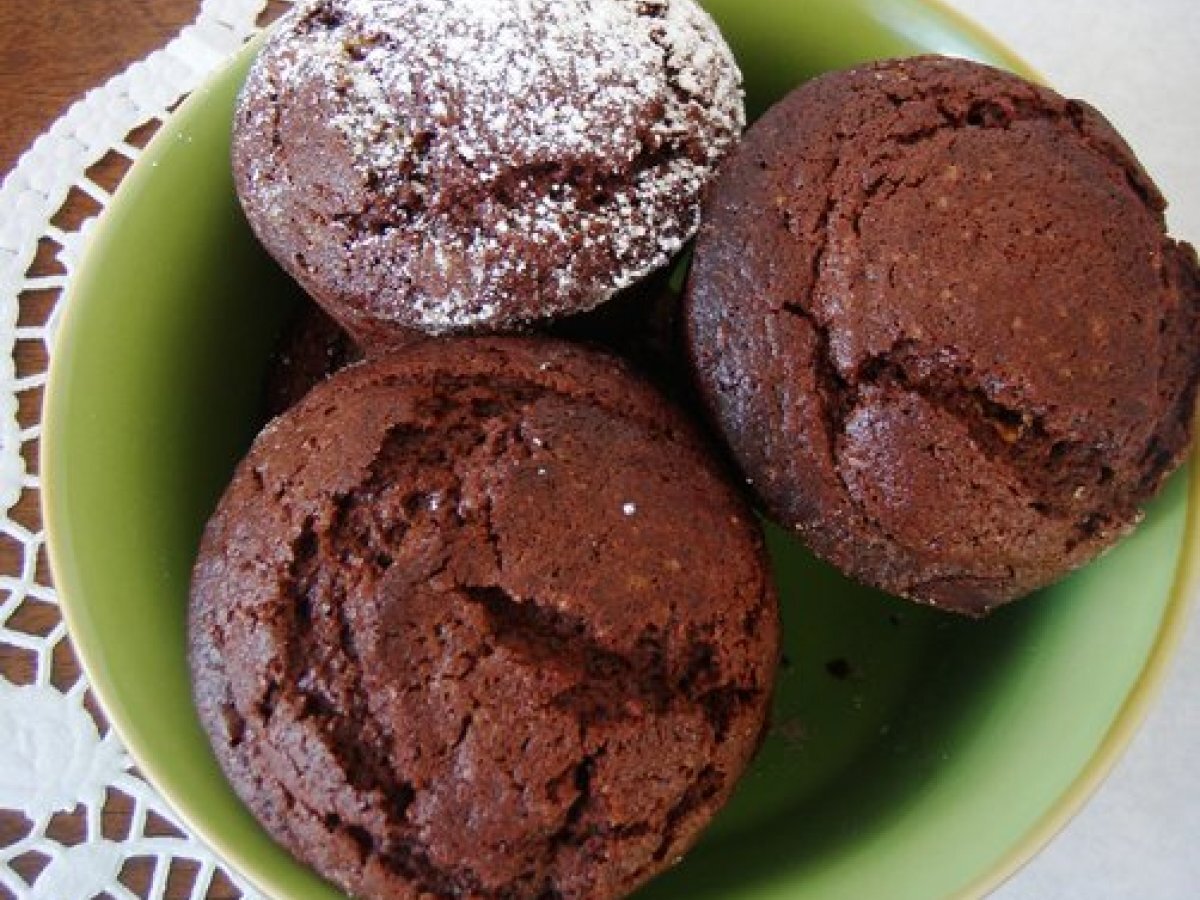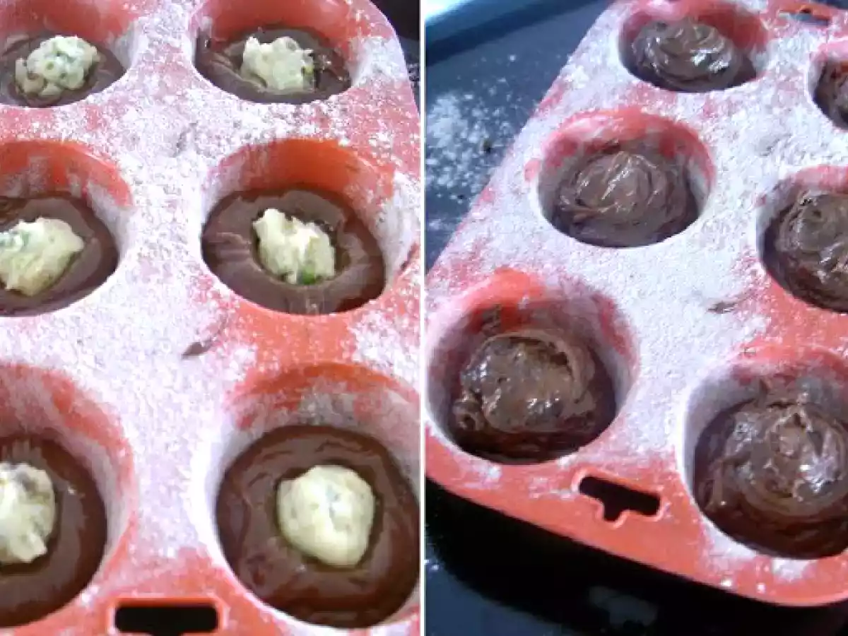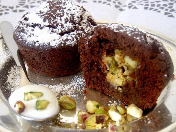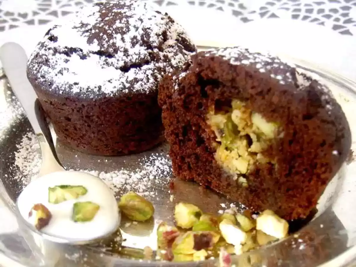 Piccoli muffins al cioccolato con cuore di pistacchio _ pisztàciàs csokis muffins vota adesso PrecedenteProssimo Snackfacile1 h 10 m Invia questa ricetta ad un amico Stampa la ricetta Contatta l'autore della Ricetta Pubblica la foto di questa ricetta Ingredienti 5 120 g di cioccolato amaro tritato 60 g di burro 3 cucchiai di zucchero 2 uova 60 g di farina setacciata 2 cucchiai di cacao 1 cucchiaino di lievito Per il ripieno 60 g di cioccolato bianco tritato 15 g di burro 2 cucchiai di pistacchi tritati Per la panna montata aromatizzata 2 dl di panna 20 g di zucchero a velo ½ cucchiaino di estratto di mandorla Per decorare: 2 cucchiai di pistacchi tritati