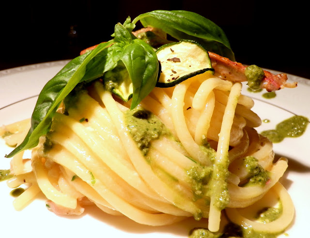 Spaghettoni con triglie, zucchine e pesto alle erbe