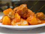 Ingredienti: 400 g bocconcini di manzo leggermente grassi 3 patate medie 2 carote 1 costa di sedano 1 scalogno 2 cucchiai di salsa di pomodoro brodo...