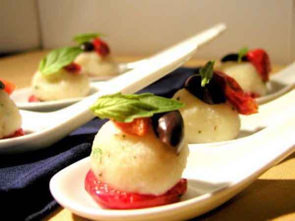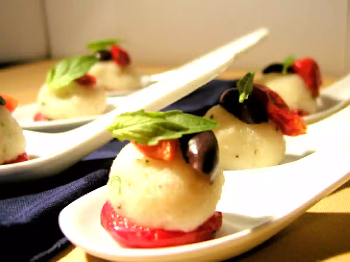 Appetizer - quenelle di patate e baccalà su pomodoro confit e olive taggiasche