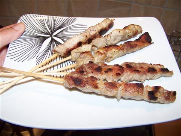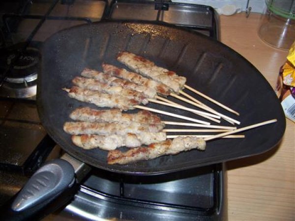 - Passato questo tempo, far scaldare sul fuoco una piastra antiaderente e adagiarci gli spiedini. Far cuocere, girando di tanto in tanto, finché saranno ben dorati. Servire subito.