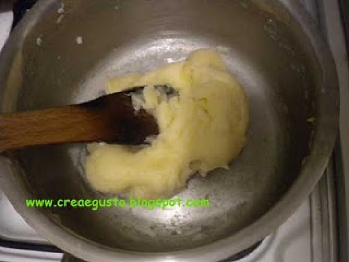 Quando il burro e l'acqua saranno amalgamati aggiungere la farina a pioggia e mescolate energicamente finchè il composto non sarà sodo e non si staccherà dalla pentola. - Mettete il composto in una terrina e schiacciatelo per farlo raffreddare.