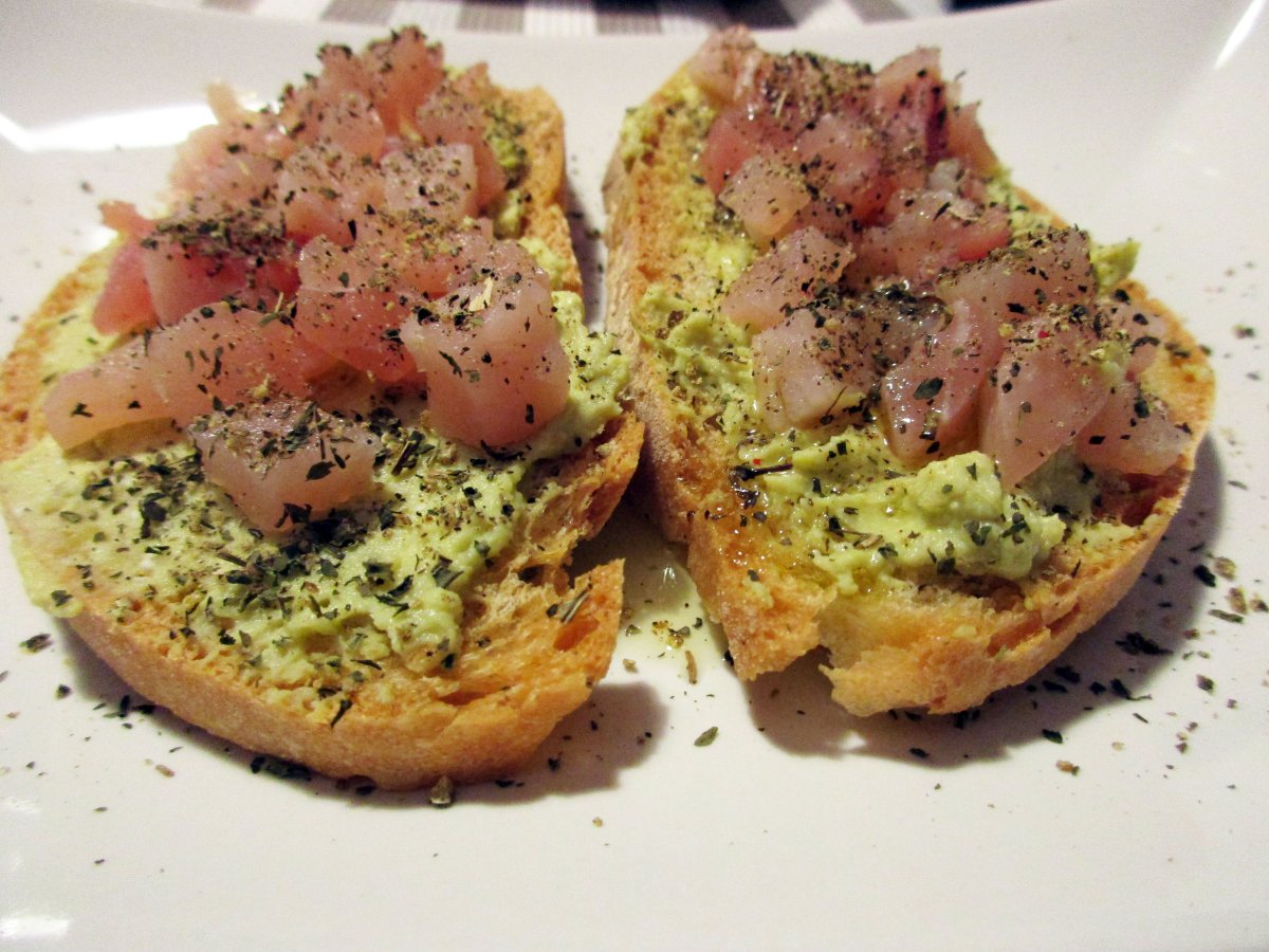Bruschetta con pesce spada, crema di ricotta e piselli