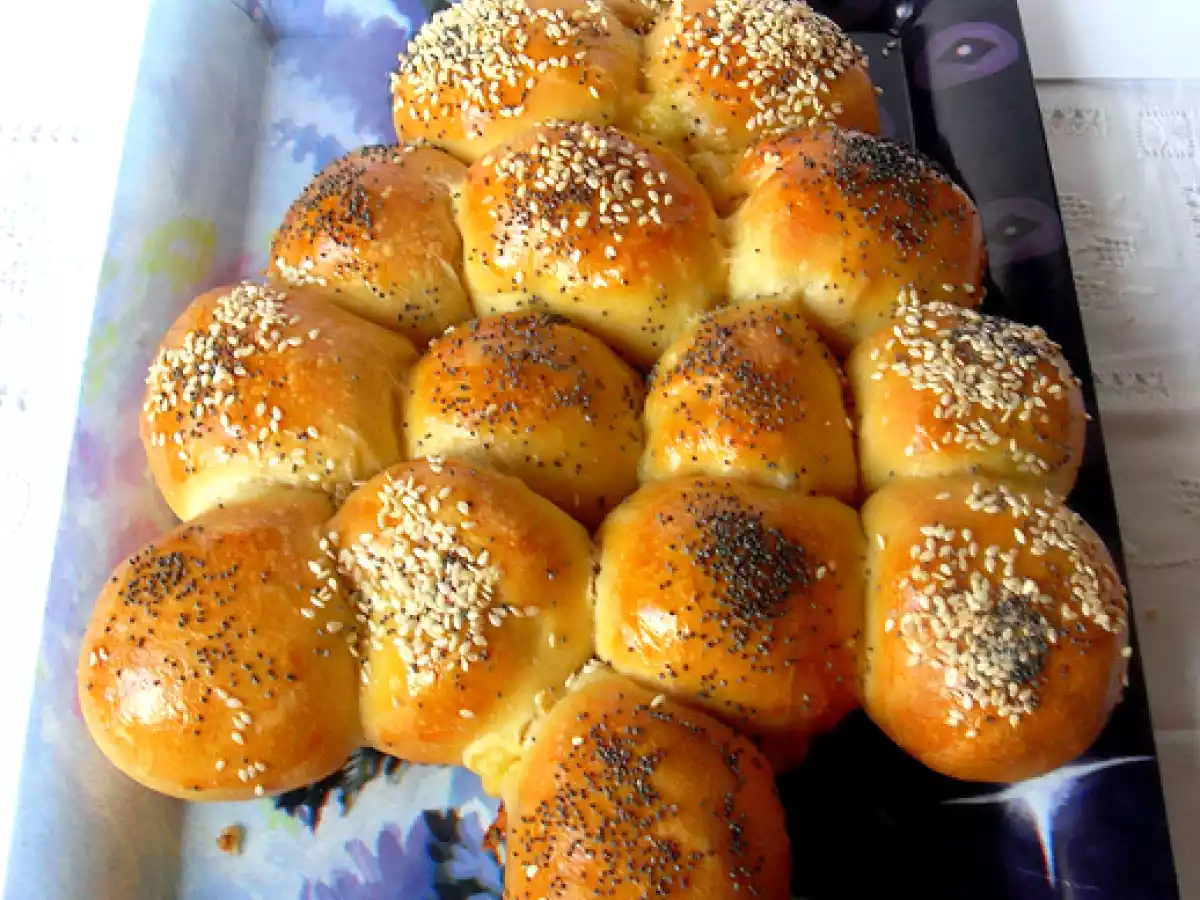 - Una volta create le 16 palline disponetele a forma di albero di natale direttamente su una placca rivestita con carta forno e lasciatele lievitare di nuovo per 1/2 ora. Passata la mezz?ora le palline, crescendo, si saranno attaccate fra di loro. Spennellate con il tuorlo versate i semi di ed inforna a 180° per circa 30 minuti.