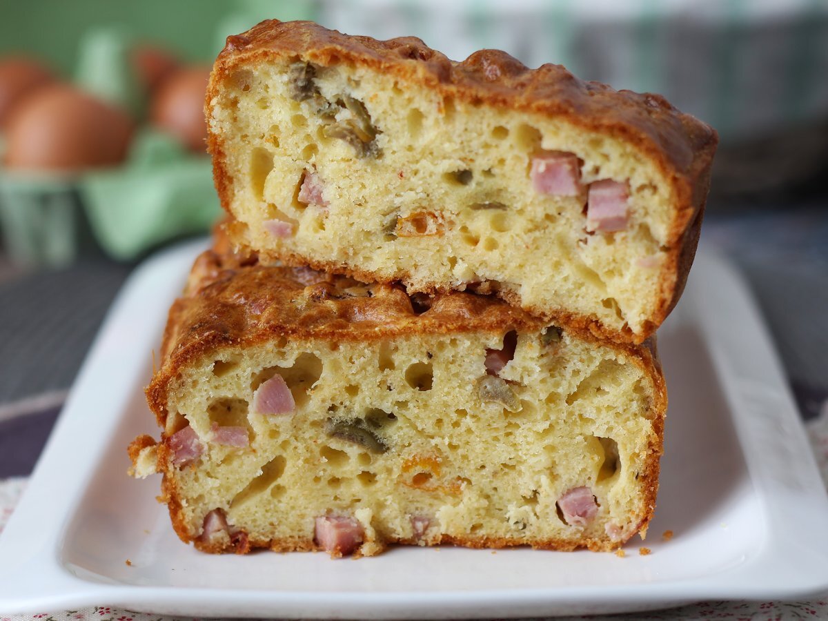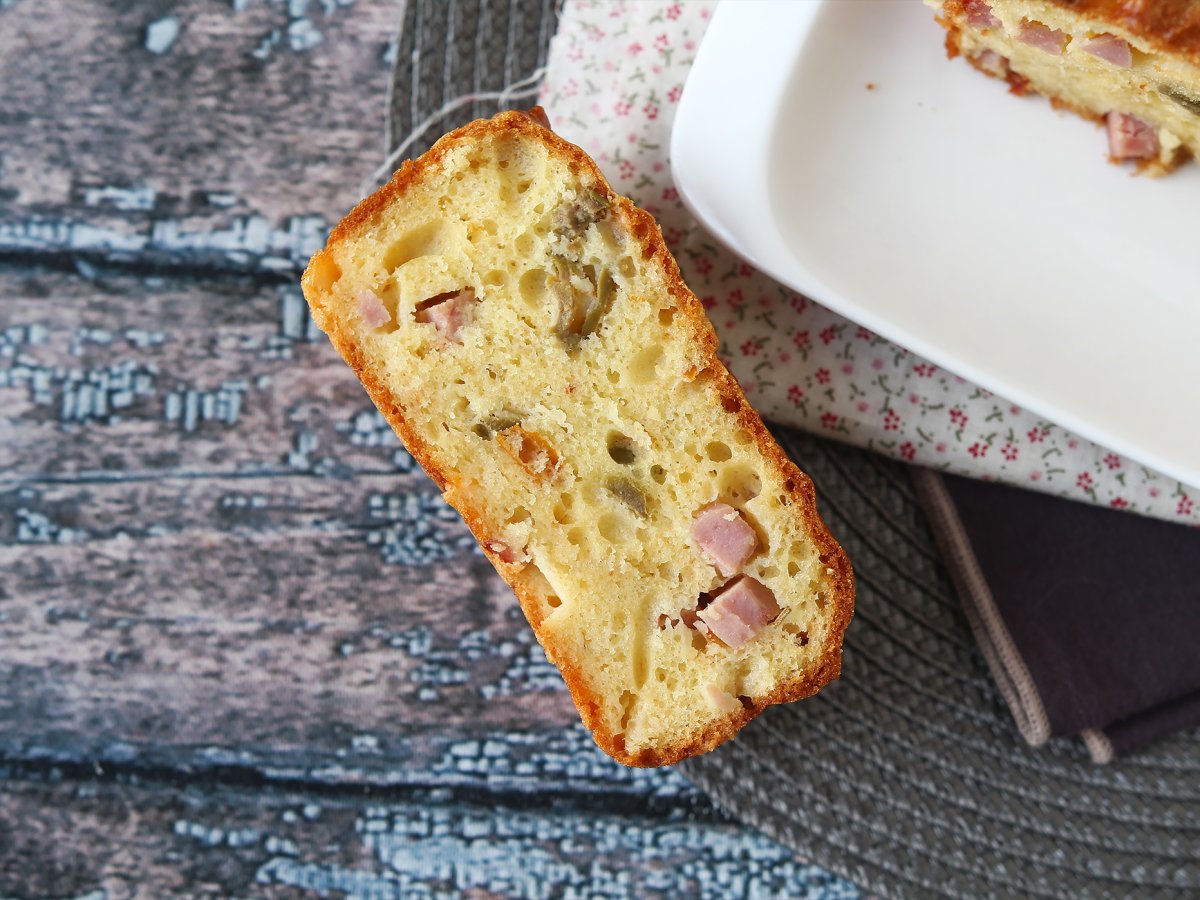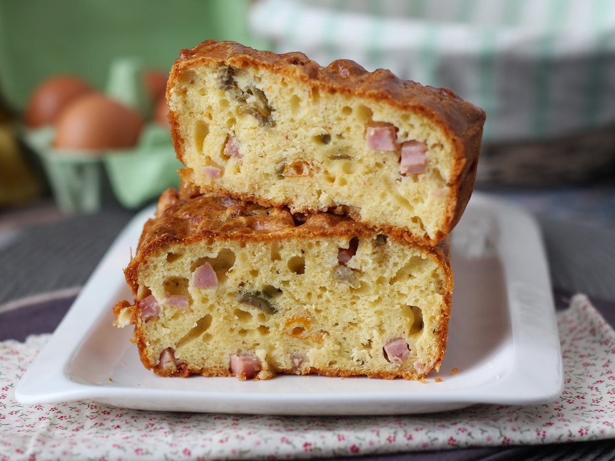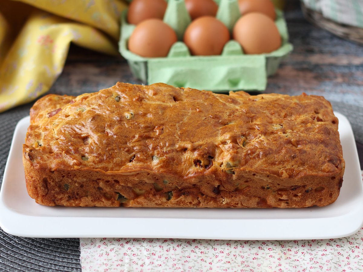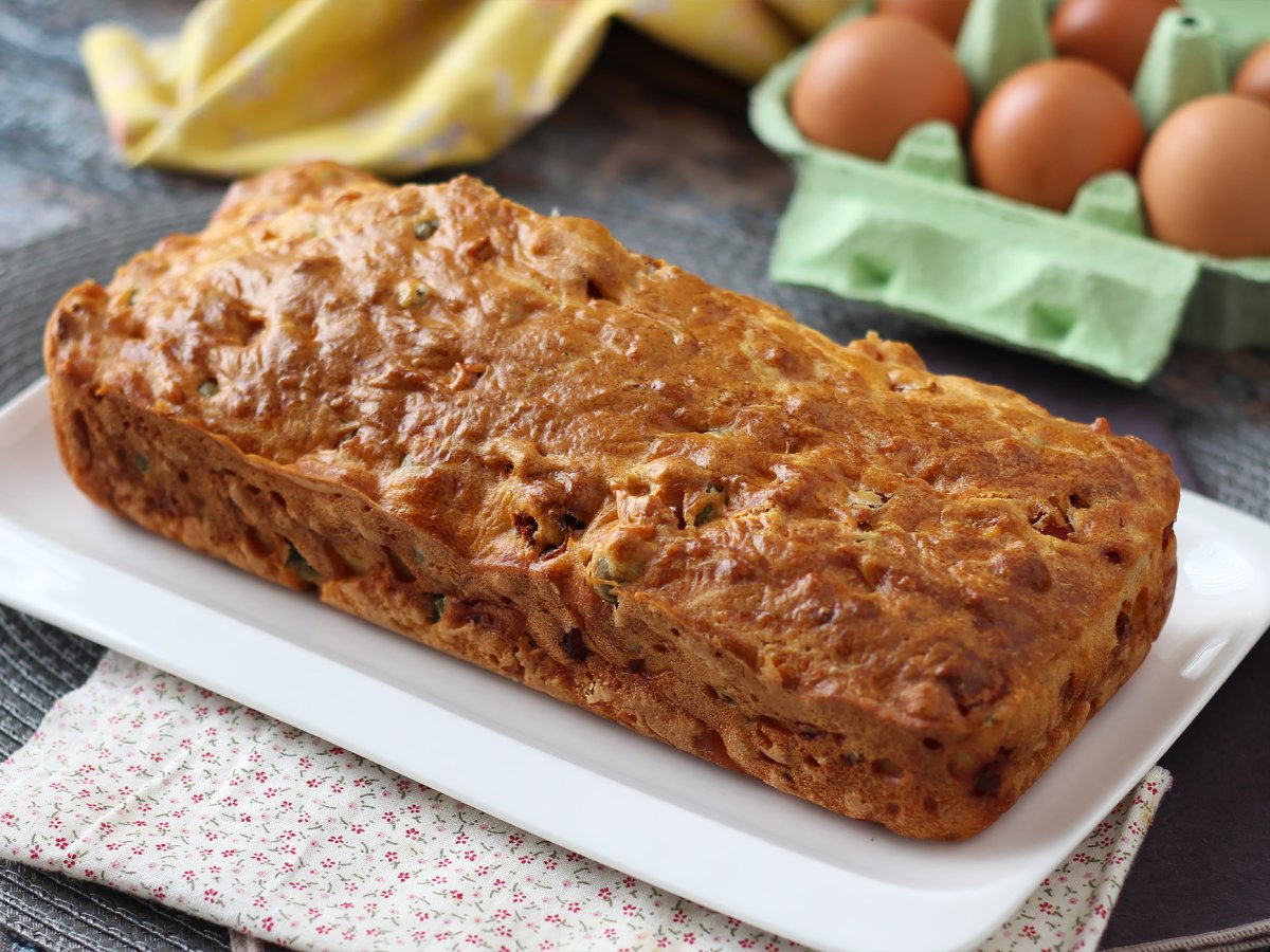 Cake salato con skyr, prosciutto cotto, olive e pomodori secchi