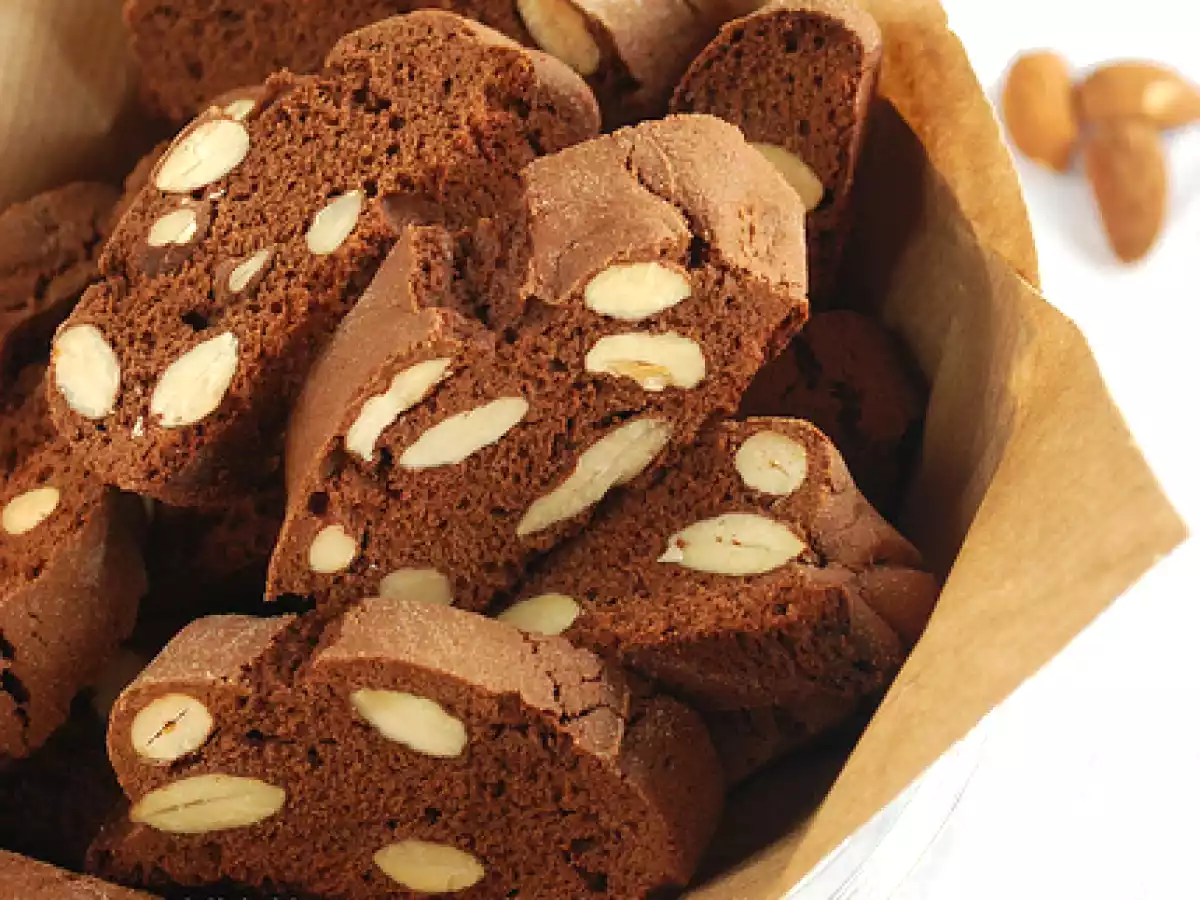 Cantucci al cioccolato vota adesso Stuzzicheriefacile1 h 20 m Invia questa ricetta ad un amico Stampa la ricetta Contatta l'autore della Ricetta Pubblica la foto di questa ricetta Ingredienti 4 280 g Farina 00 200 g Cioccolato fondente - 60% cacao 2 Uova 100 g Zucchero semolato 20 g Zucchero di canna 150 - 200 g Mandorle sgusciate Ammoniaca per dolci, 1 cucchiaino raso Burro, una noce 20 ml Caffè ristretto Rhum, 3 cucchiai Vaniglia