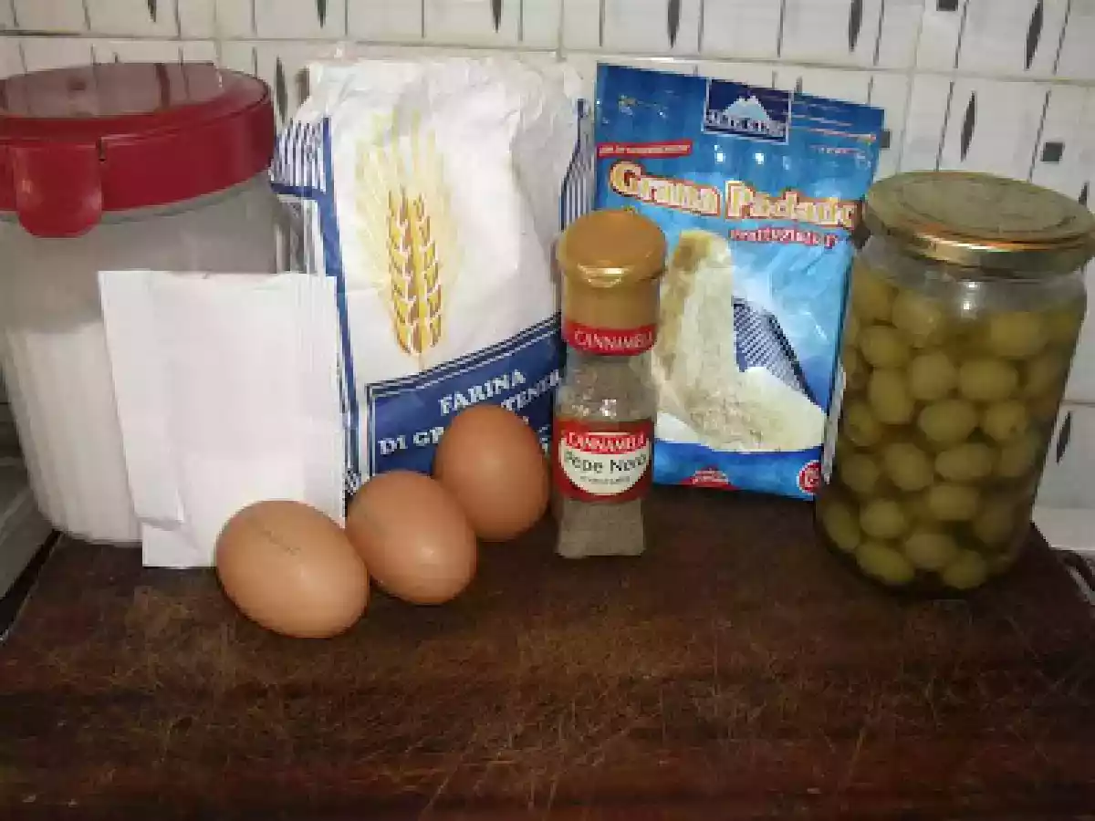 Setacciare la farina con il lievito ed il sale. - Aggiungere il pepe, il parmigiano, le olive tritate grossolanamente e le uova.