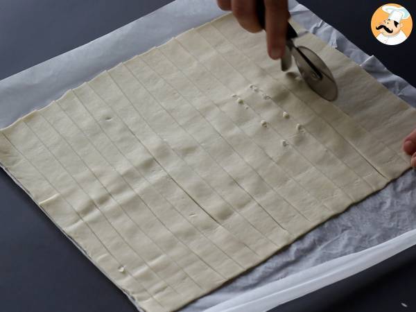 Tagliate la pasta sfoglia a strisce larghe circa 1 cm. Da una pasta sfoglia rettangolare se ne ricavano 16
