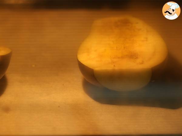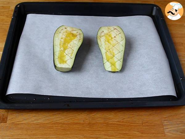 Tagliate la melanzana in 2 nel senso della lunghezza. Con un coltello fate delle incisioni nella polpa, poi versatevi su un filo d'olio.