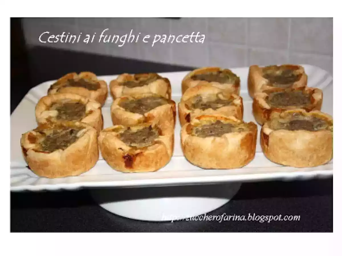 Cestini ai funghi e pancetta Stuzzicheriefacile45 min569 Kcal Invia questa ricetta ad un amico Stampa la ricetta Contatta l'autore della Ricetta Pubblica la foto di questa ricetta Ingredienti 5 2 dischi di pasta sfoglia rotondi 500 g di funghi 100 g di pancetta steccata affettata non troppo sottile 2 uova Latte qb 1 spicchio di aglio Prezzemolo Costo stimato: 6.02Euros€ (1.2€/Porzioni)