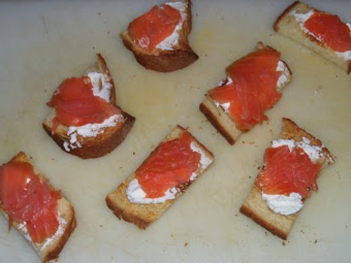 Crostini al salmone vota adesso Stuzzicheriefacile30 min Invia questa ricetta ad un amico Stampa la ricetta Contatta l'autore della Ricetta Pubblica la foto di questa ricetta Ingredienti 4 Qualche fetta di pane tipo toscano 50 g di ricotta 100 g di salmone affumicato