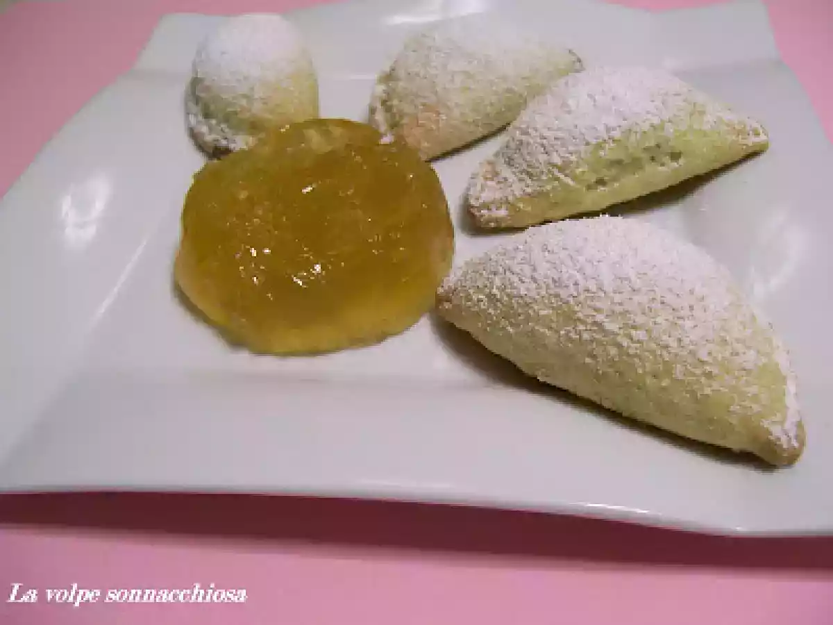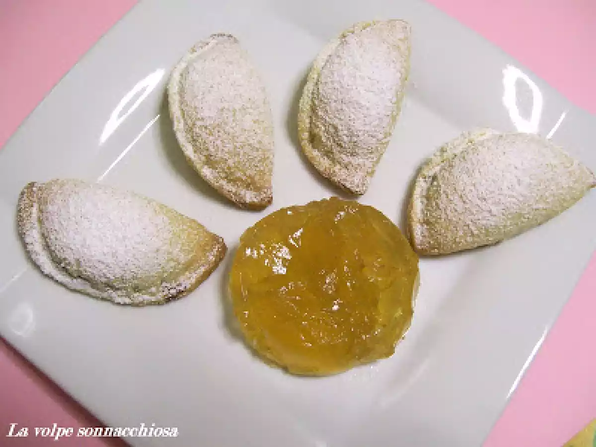 Fagottini di mele PrecedenteProssimo Stuzzicheriefacile50 min Invia questa ricetta ad un amico Stampa la ricetta Contatta l'autore della Ricetta Pubblica la foto di questa ricetta Ingredienti 5 1) 500 gr. di pasta frolla già pronta 4 mele 5 cucchiai di zucchero di canna 80 gr. di uva sultanina 25 gr. di pinoli 100 gr. di amaretti un pizzico di cannella zucchero a velo 2) Per la gelatina: 500 ml di succo di mela 10 fogli di colla di pesce