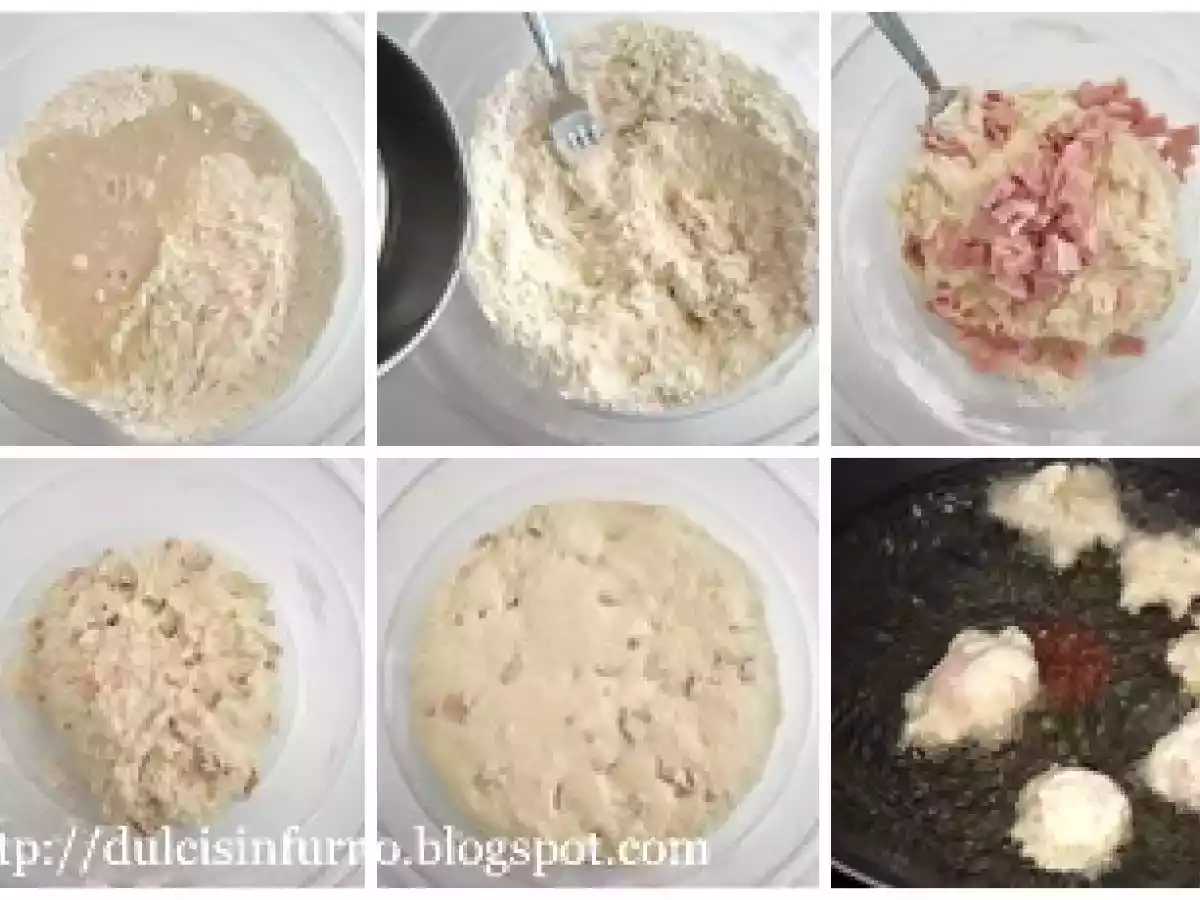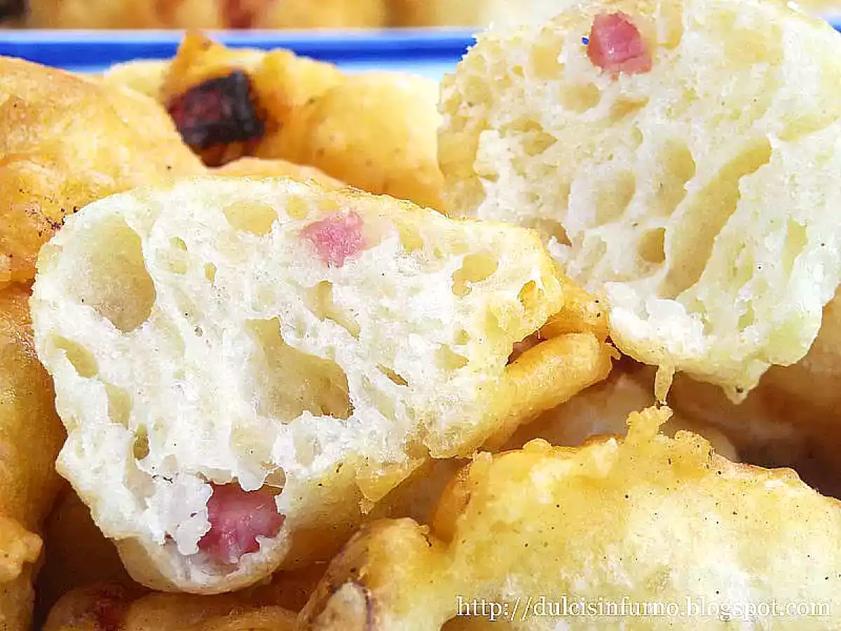 Frittelle al prosciutto PrecedenteProssimo Stuzzicheriefacile1 h 5 m Invia questa ricetta ad un amico Stampa la ricetta Contatta l'autore della Ricetta Pubblica la foto di questa ricetta Ricetta facile e sfiziosa Ingredienti 4 275 g di farina 185 ml di acqua tiepida 1/4 cubetto di lievito di birra 2 fette spesse 5mm di prosciutto cotto 1 cucchiaino di sale 1 cucchiaino raso di zucchero olio per friggere