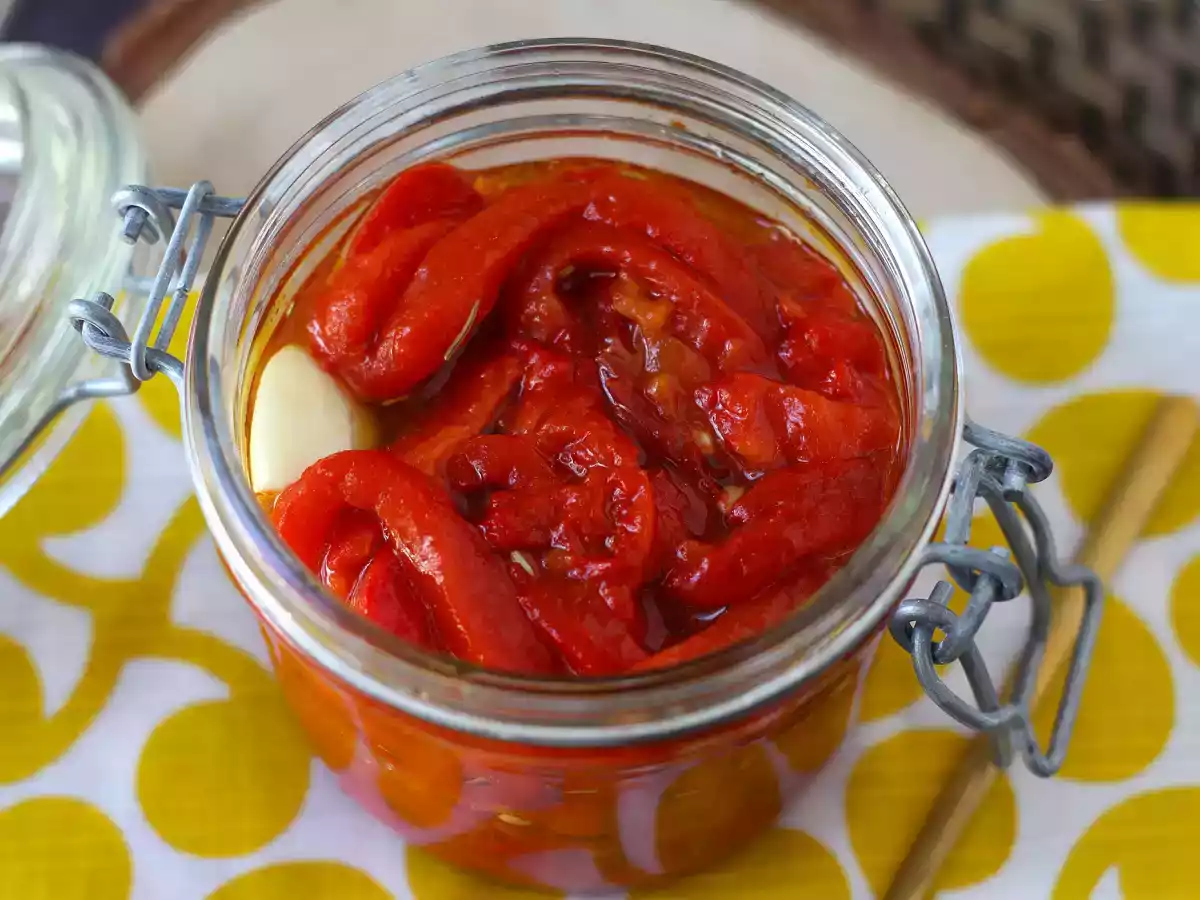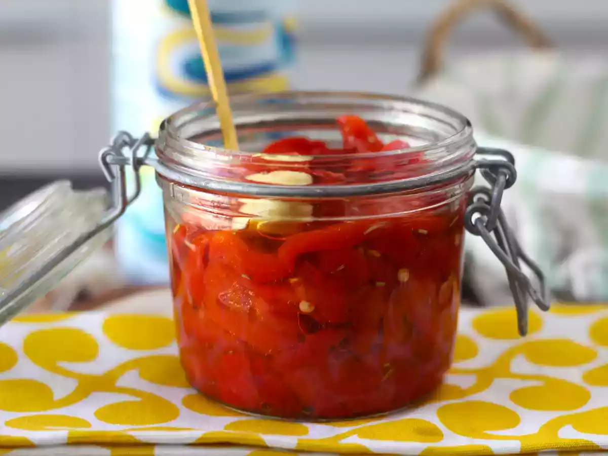 Mettete i peperoni in un contenitore. Aggiungete l'olio, gli spicchi d'aglio puliti, il rosmarino, il sale e mescolate per bene. Tappate e lasciateli i in frigorifero per almeno 1 ora prima di utilizzarli