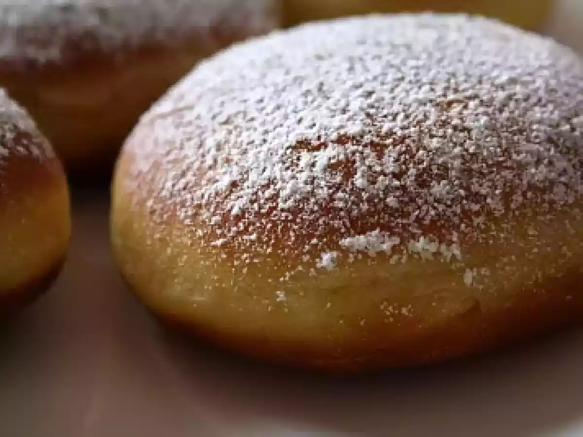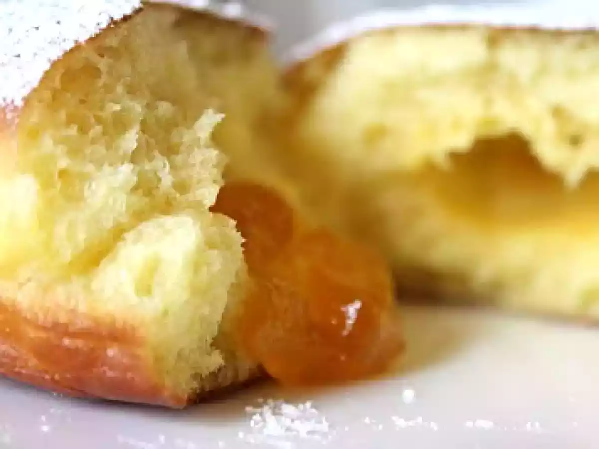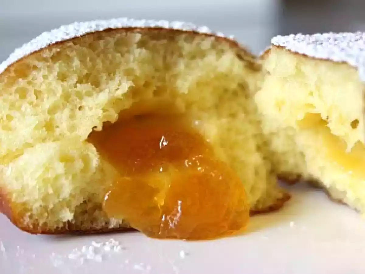 Krapfen (o bomboloni) PrecedenteProssimo Stuzzicheriefacile50 min Invia questa ricetta ad un amico Stampa la ricetta Contatta l'autore della Ricetta Pubblica la foto di questa ricetta Ingredienti 6 500 g di farina 00 10 g di lievito di birra secco per panetteria 3 uova + 2 tuorli 80 g di burro fuso tiepido 50 ml + 50 ml di acqua tiepida 100 g di zucchero + 1 cucchiaino per attivare il lievito 1 cucchiaino di estratto di vaniglia 1/2 cucchiaino di sale qualche cucchiaio di latte 100 g di confettura di albicocca olio di semi per friggere zucchero a velo per decorare
