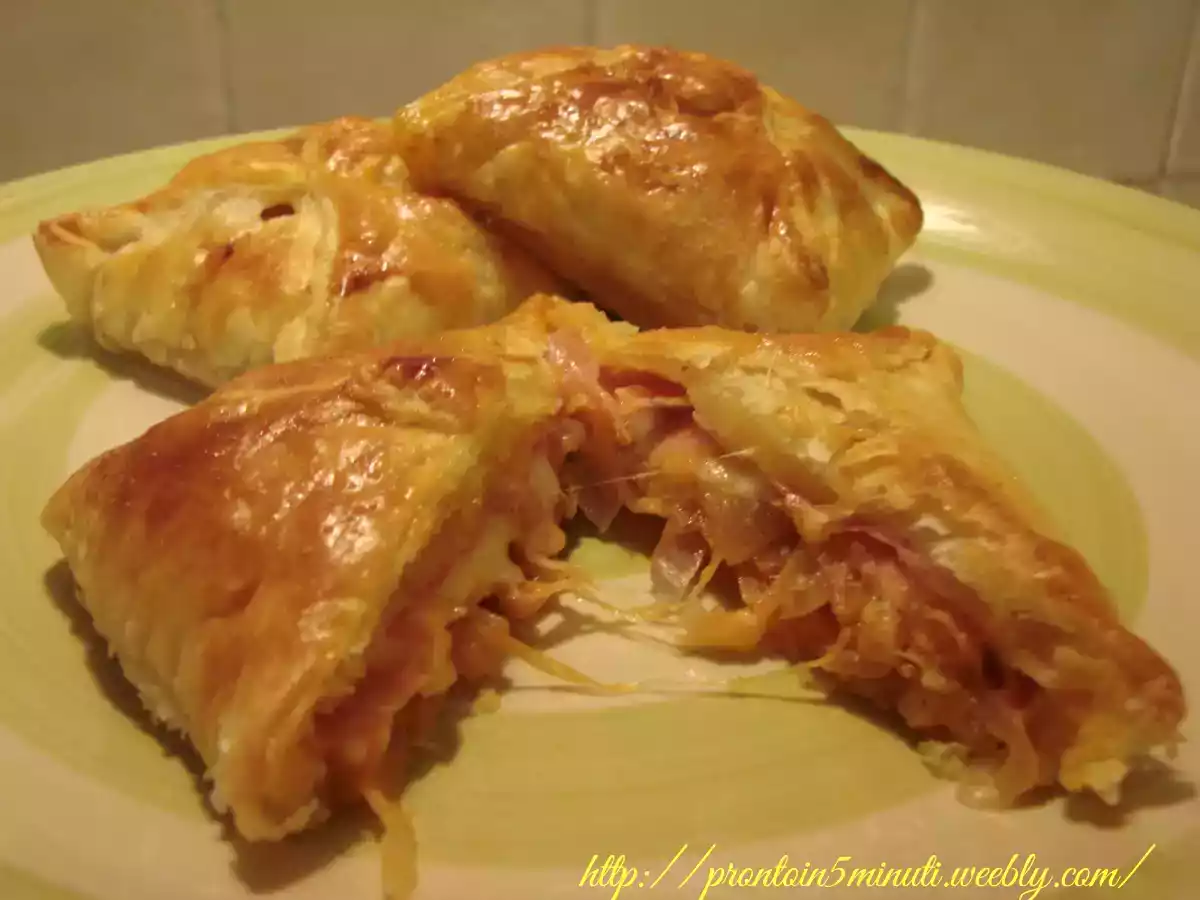 Una volta cotte, lasciare raffreddare. Nel frattempo tagliare la pasta sfoglia ricavando 6 quadrati, dove andremo a posizionare uno strato di cipolle ormai fredde, la mozzarella e il prosciutto cotto. Richiudere le cipolline ripiegando gli angoli sigillando bene. Spennelare la superficie con l'uovo precedentemente sbattuto