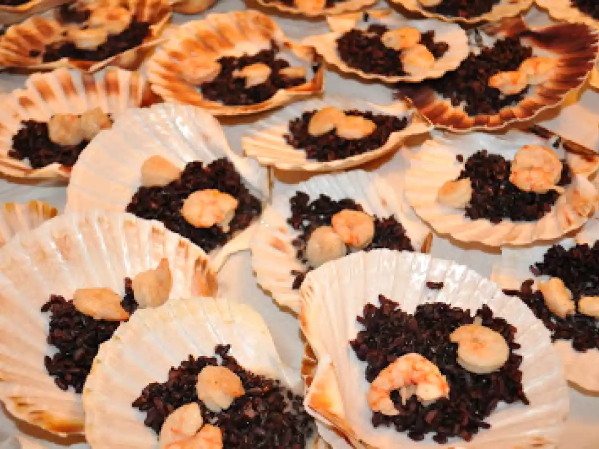 Le ricette della festa. riso venere con gamberi alla vaniglia, latte di cocco e rum. PrecedenteProssimo Stuzzicheriefacile45 min Invia questa ricetta ad un amico Stampa la ricetta Contatta l'autore della Ricetta Pubblica la foto di questa ricetta Ingredienti 12 300 g riso venere 12 gusci di cappesante, ben raschiati e puliti 24 gamberi freschissimi 2 stecche di vaniglia latte di cocco, 1 bicchiere rum burro, una cucchiaiata sale