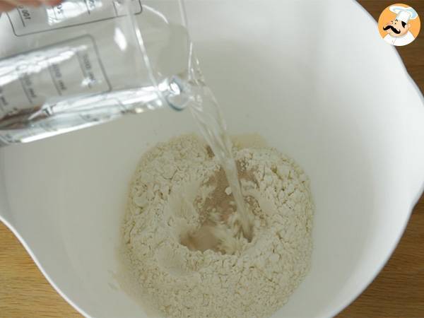Mettete in una ciotola la farina ed il sale. Poi aggiungete il lievito e versate l'acqua tiepida. Adesso lavorate il composto, poi formate un panetto e lasciatelo riposare in un posto caldo per 30 minuti.