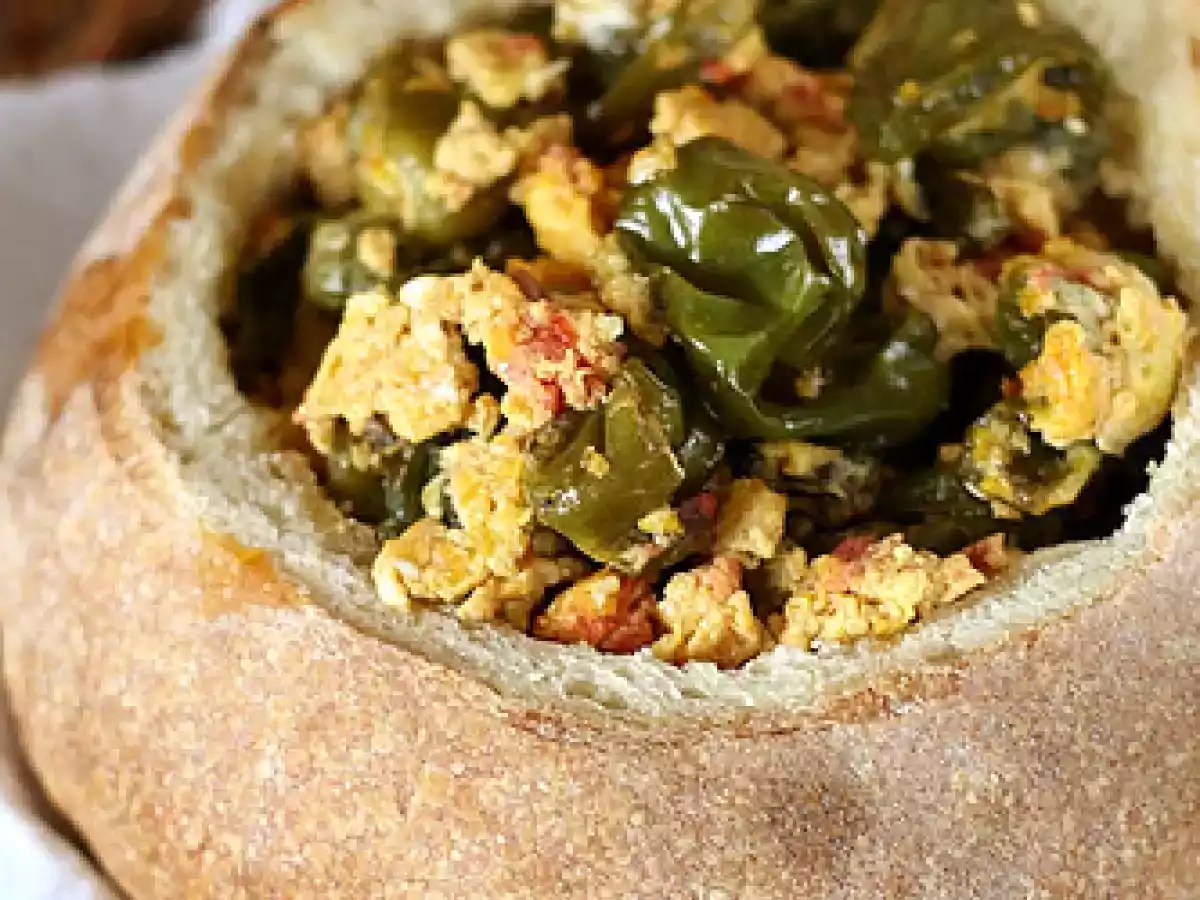 Pane imbottito con ciambotta di friggitelli e uova. PrecedenteProssimo Stuzzicheriefacile12 h 30 m Invia questa ricetta ad un amico Stampa la ricetta Contatta l'autore della Ricetta Pubblica la foto di questa ricetta Ingredienti 4 350 g farina0 150 g farina di semola 150 g di lievito madre in forza 325 g acqua 10 g sale 2 cucchiai di olio 400 g di peperoncini verdi o friggitelli, possibilmente molto piccoli. 5 uova Olio extra vergine di oliva qb Passata di pomodori 3 cucchiai Sale