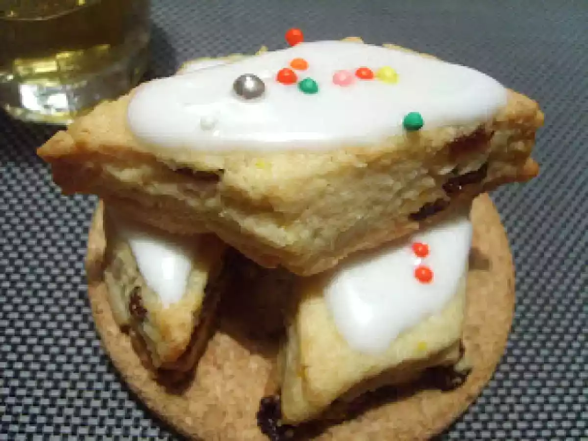 - Impastate la farina con il burro già morbido lavorando con la punta delle dita, poi aggiungete l'uovo intero e il tuorlo, lo zucchero, la scorza grattugiata del limone e dell'arancia, un pizzico di sale, le mandorle tritate e a scaglie e l'uvetta. Se l'impasto non si amalgamasse bene, aggiungete un po' di succo d'arancia.