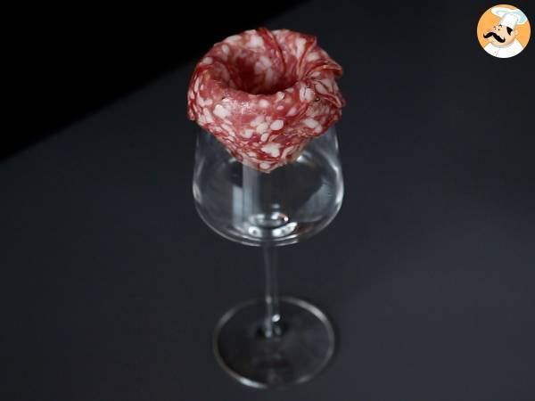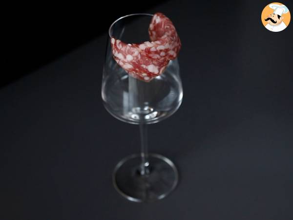 Piegate in due una fetta di salame sul bordo del bicchiere. Aggiungete un'altra fetta sopra, spostandola lateralmente (partendo dalla metà della prima)
