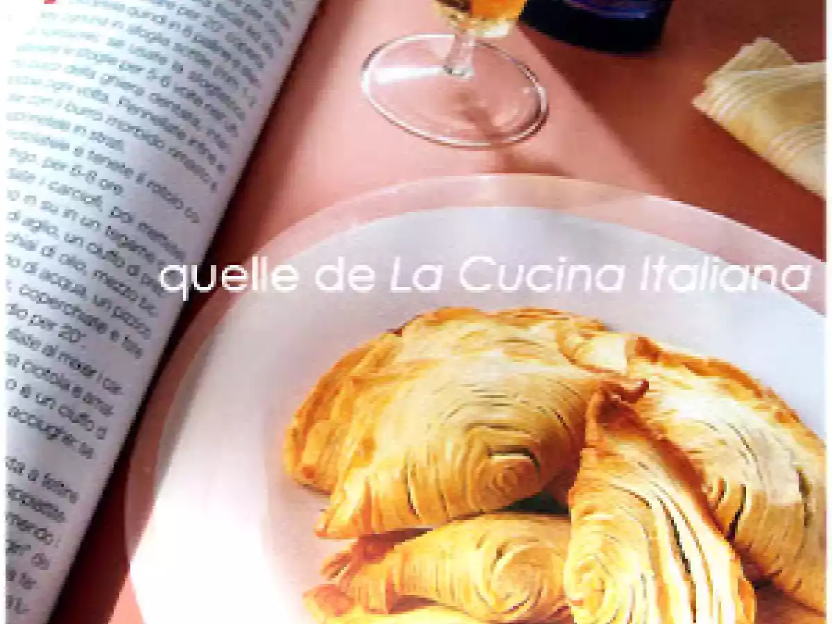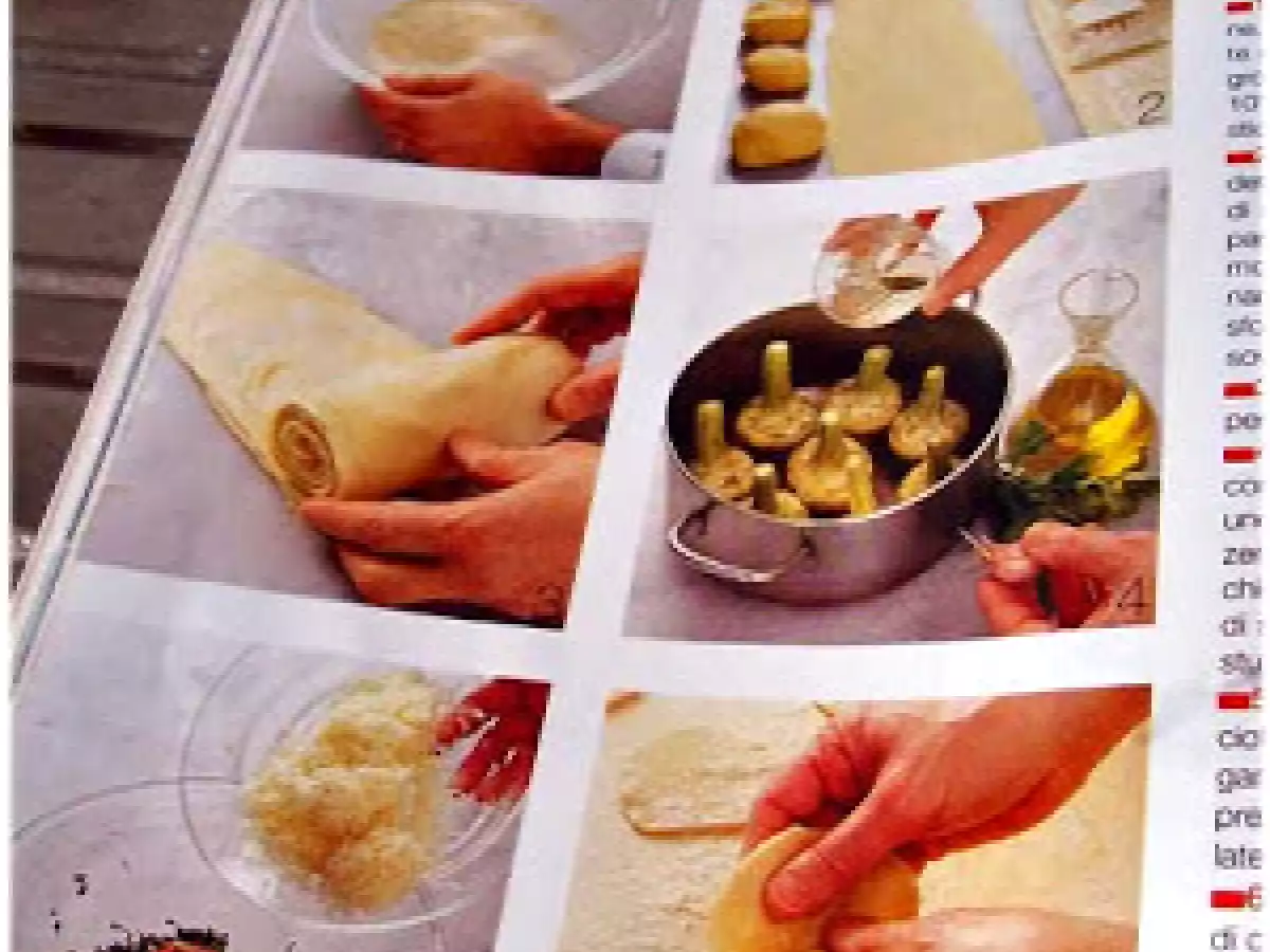 Salatini di sfoglia ai carciofi vota adesso PrecedenteProssimo Stuzzicheriefacile1 h 10 m Invia questa ricetta ad un amico Stampa la ricetta Contatta l'autore della Ricetta Pubblica la foto di questa ricetta Ingredienti 4 300 g farina 00 100 g farina di grano duro 145 g burro 120 g pecorino stagionato grattugiato 8 carciofi acciughe sott'olio 6 filetti 2 uova aglio, prezzemolo vino bianco secco olio e.v.o sale, pepe