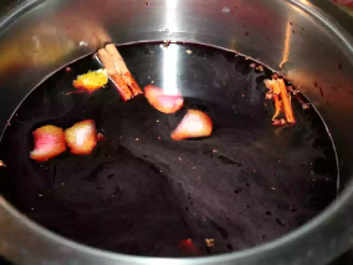 - Portate a ebollizione a fuoco basso, mescolando per far sciogliere completamente lo zucchero. Fate bollire qualche minuto, poi avvicinate una fiamma alla superficie del vino, l'alcool prenderà fuoco, finchè sarà esaurito e si spegnerà.