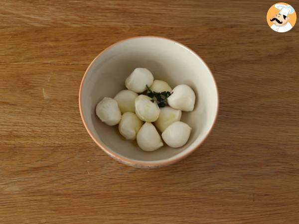 Mettete in una ciotola le mozzarelline, aggiungete un filo d'olio d'oliva ed il basilico sminuzzato. Quindi mescolate.