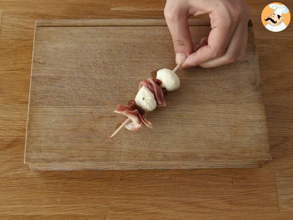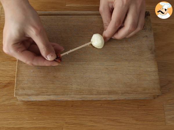 Ora infilzate una mozzarellina con lo spiedino, aggiungete un pezzo di prosciutto crudo, poi un pezzo di pomodoro secco.