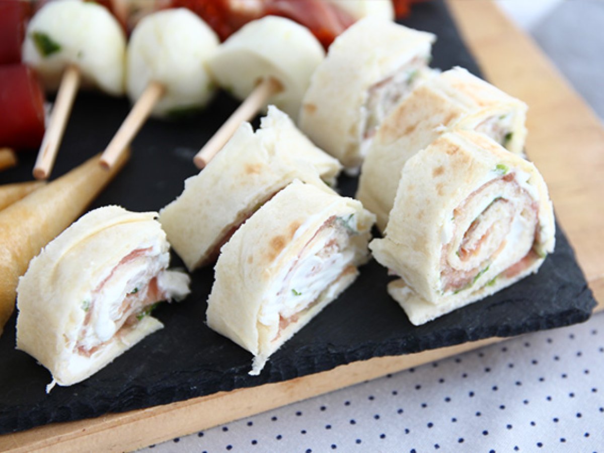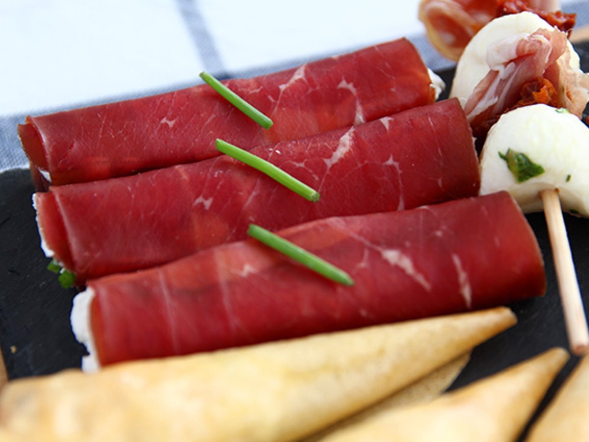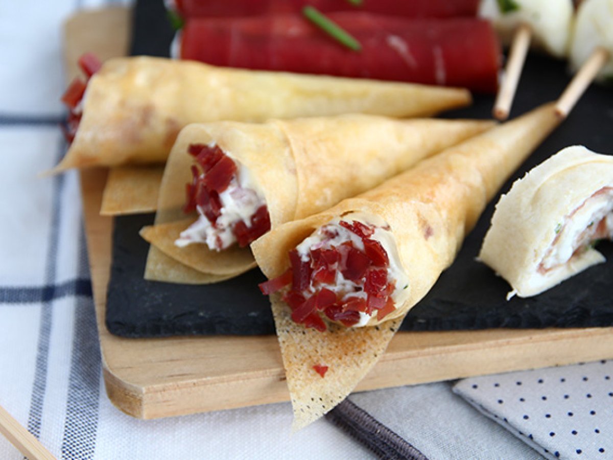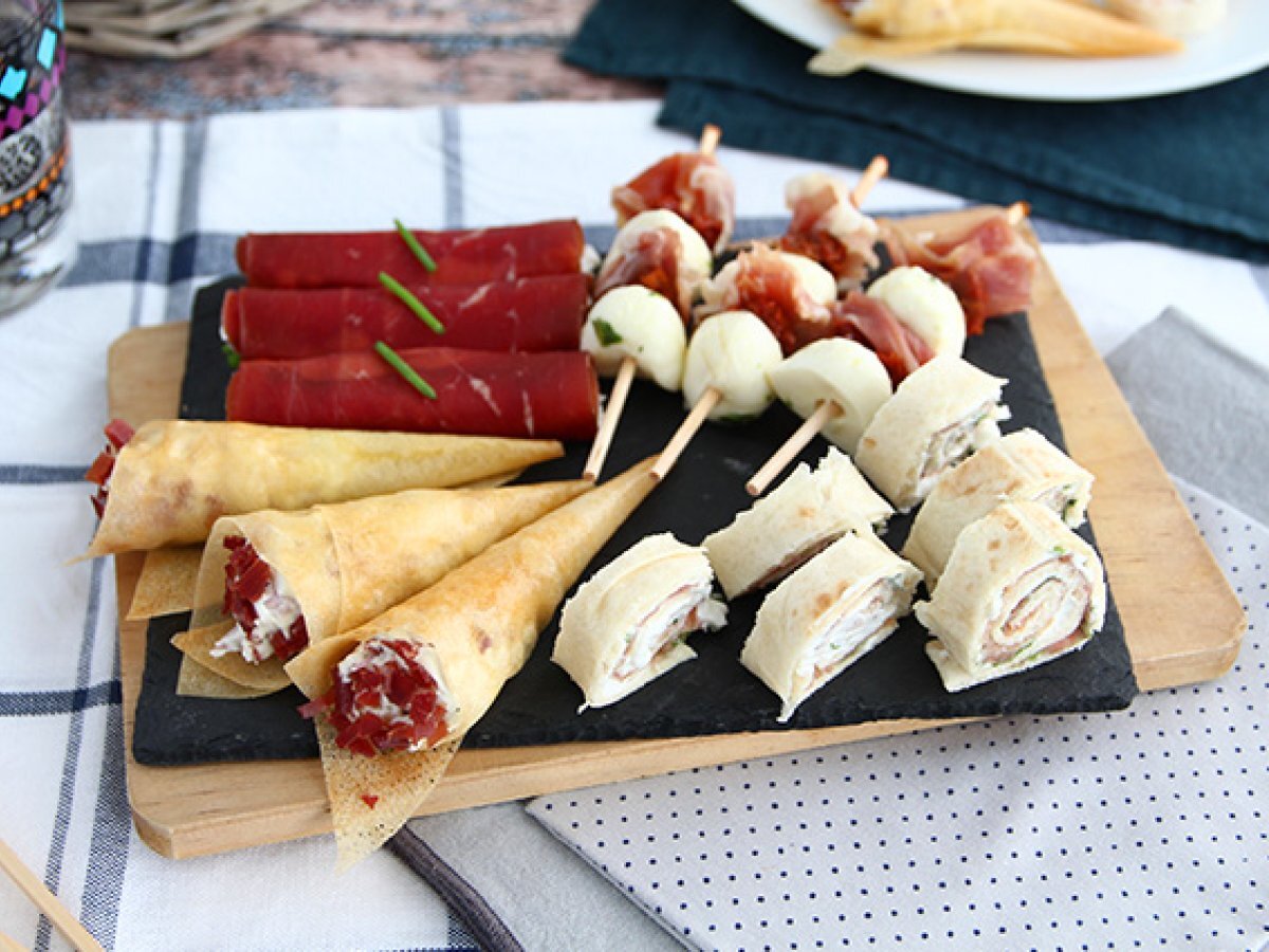 Le ricette presentate includono coni di pasta brick con crema al formaggio e bresaola, involtini di bresaola e formaggio di capra, rotolini di piadina con prosciutto crudo e rucola, e spiedini di mozzarella, prosciutto crudo e pomodori secchi.