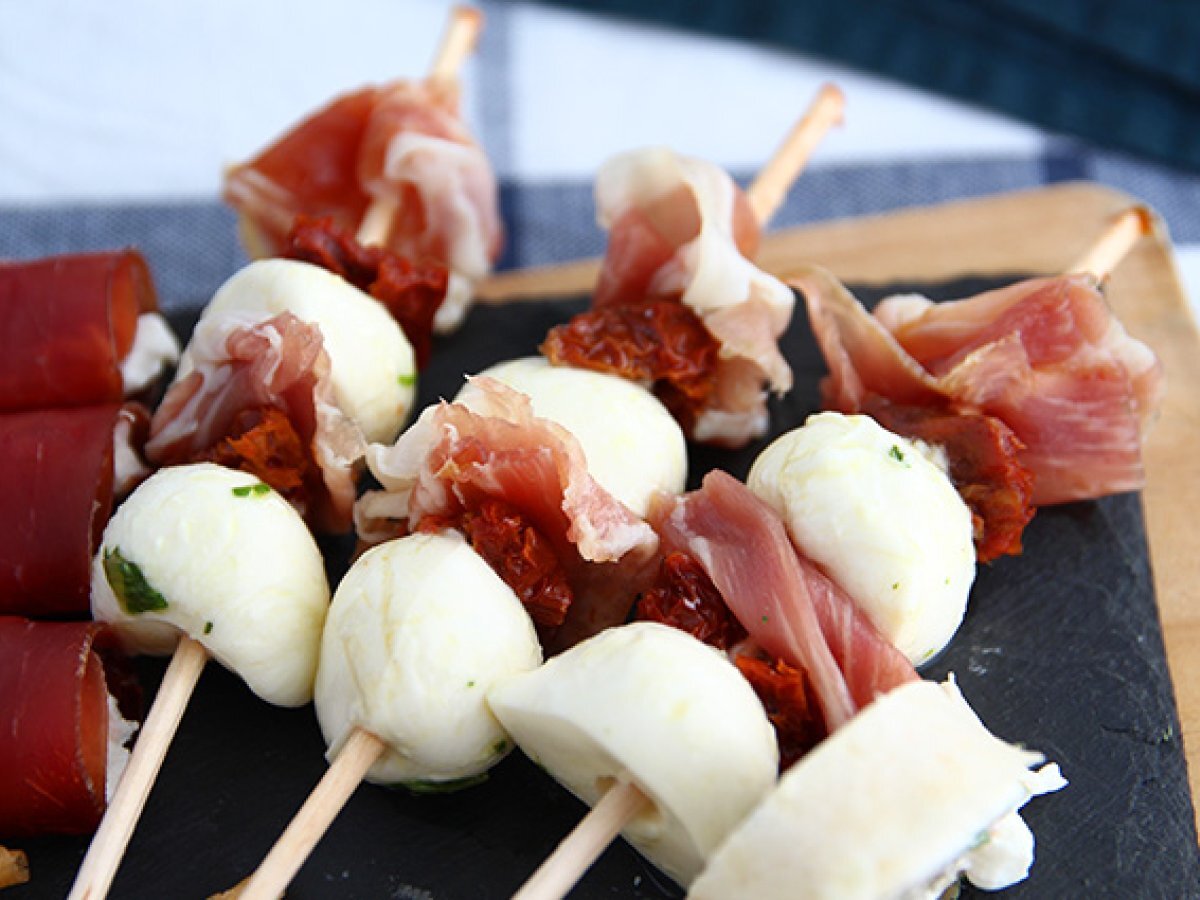 Spiedini di mozzarella, prosciutto crudo e pomodori secchi: