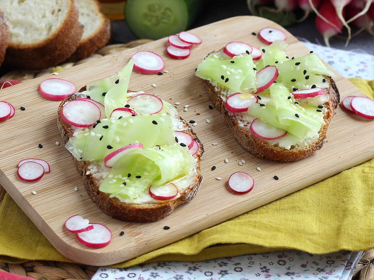 Bruschette con philadelphia, cetrioli e ravanelli