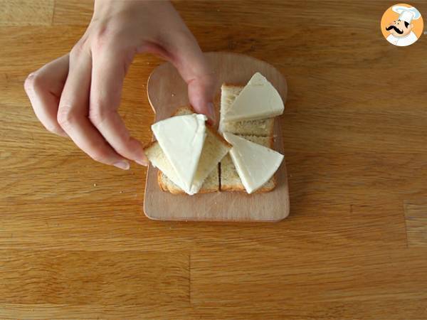 Tagliate la fetta di pancarrè in 4. Poi adagiate su ogni pezzo un formaggino triangolare in diagonale.