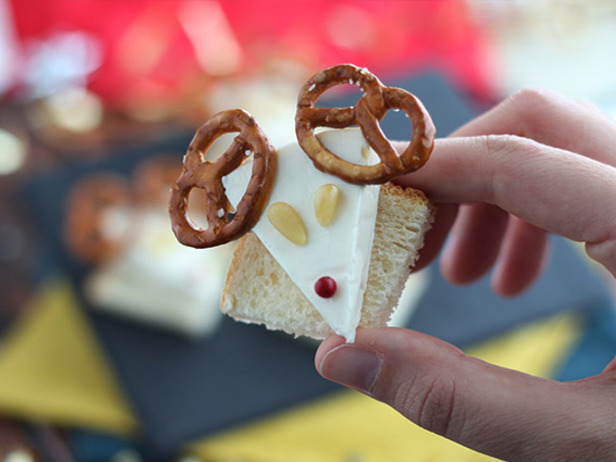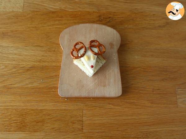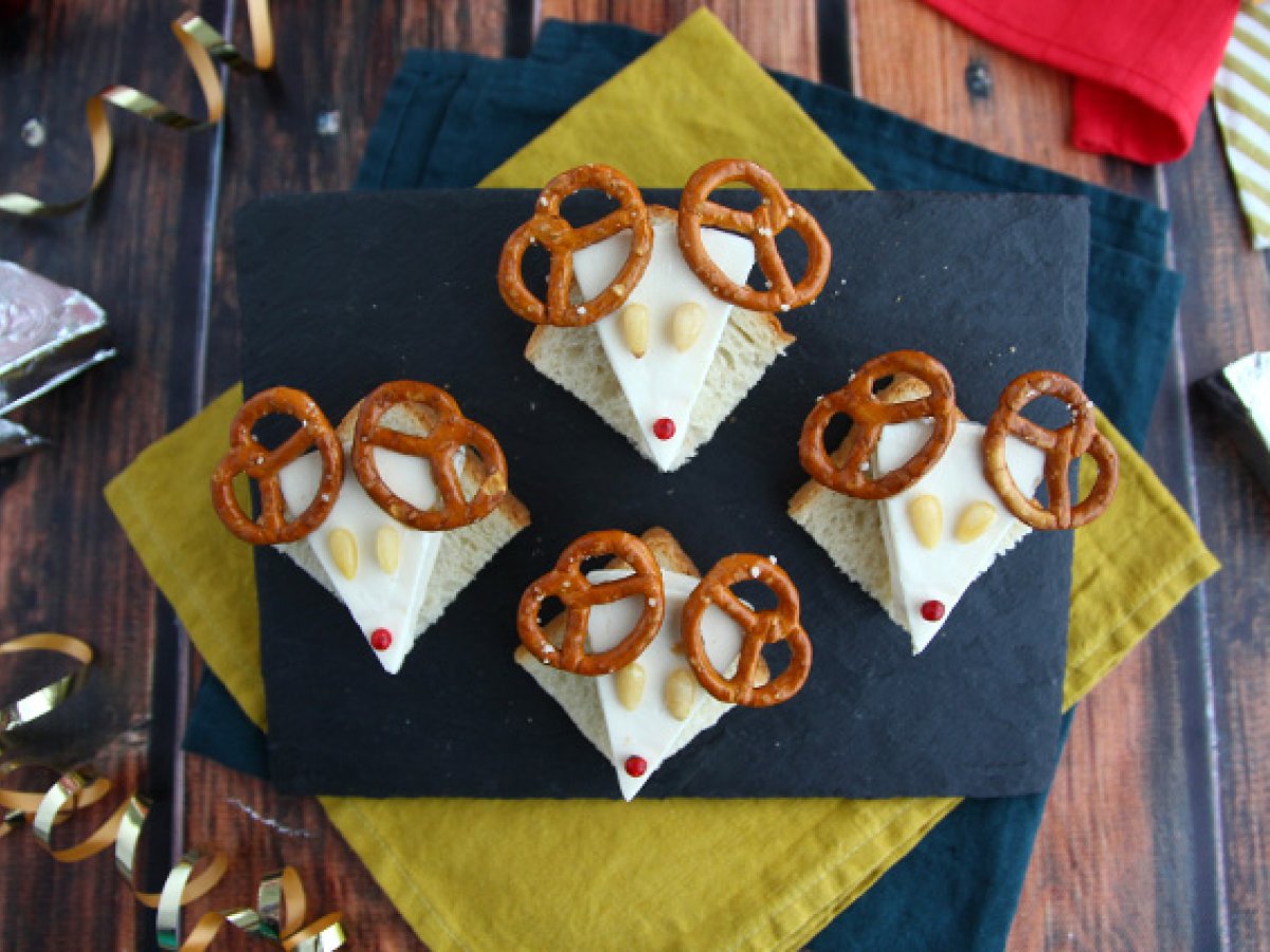 Adesso posate due mini bretzel sulla base del triangolo per realizzare le corna, poi due pinoli nel mezzo per realizzare gli occhi e un grano di pepe rosa sotto gli occhi per realizzare il naso.
