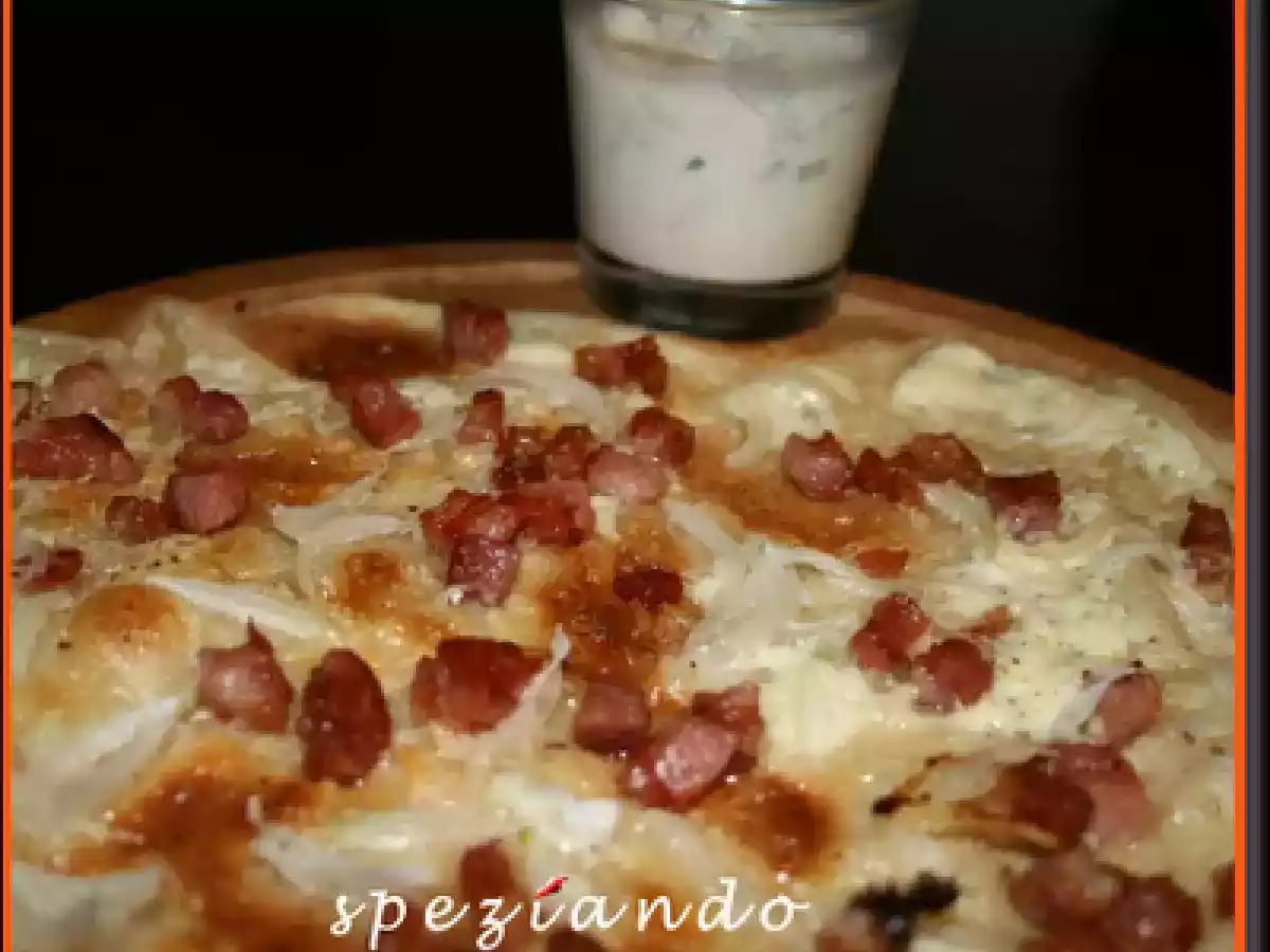 Torta alsaziana - flammenküche vota adesso Stuzzicheriefacile50 min Invia questa ricetta ad un amico Stampa la ricetta Contatta l'autore della Ricetta Pubblica la foto di questa ricetta Ingredienti 2 1) Panna Acida 400 ml panna liquida 1 yogurt naturale non zuccherato succo 1/2 limone 2) Torta Alsaziana : Pasta per la pizza 1/2 cipolla bionda 100 g di pancetta a cubetti Erba cipollina Sale e pepe