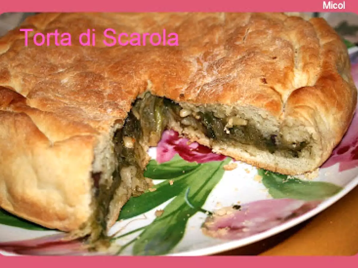 Torta di scarola Stuzzicheriefacile1 h 15 m Invia questa ricetta ad un amico Stampa la ricetta Contatta l'autore della Ricetta Pubblica la foto di questa ricetta Ingredienti 6 Per la pasta: 300 g farina un pizzico di sale un pizzico di zucchero 1/2 cubetto di lievito un bicchiere di acqua tiepida due cucchiai di olio evo Per il ripieno: olive taggiasche denocciolate 2 cespi di scarola una manciata di capperi uno spicchio d'aglio due cucchiai d'olio sale pepe