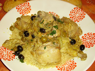 Quando il tempo è scaduto e il pollo vi sembra perfetto, mescolate delicatamente il tajine. Se vi sembra ancora troppo liquido, fatelo andare un po' senza coperchio, in modo che si asciughi. assaggiate e, se serve, aggiustate di sale e pepe, poi spargeteci sopra le foglie di coriandolo. In un tajine c'è così tanta cura e così tanto amore che non serve accompagnarlo con cose complicate, perciò servitelo soltanto con una bella terrina di couscous fumante appena appena condito.