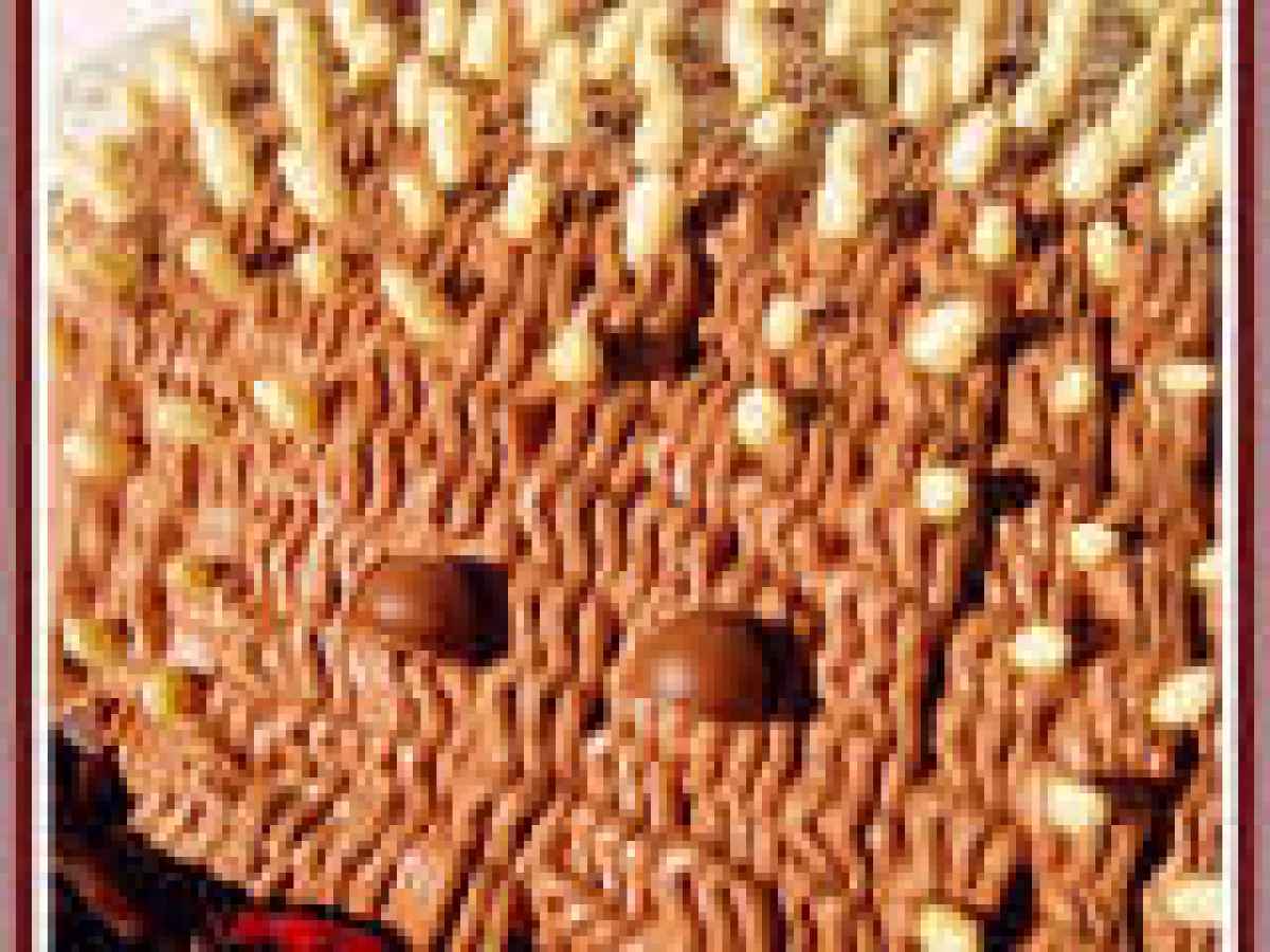 Se preferite avere solo la copertura di glassa al cioccolato potete fermarvi qui, inserendo i pinoli come aghi quando la glassa è ancora morbida, altrimenti preparare l?ultima copertura amalgamando alla panna gli altri ingredienti. Distribuire la panna alla nutella e cacao sulla superficie con una tasca da pasticcere con il beccuccio ?dentellato?. Inserire gli ?aghi?, gli occhi usando due pezzetti di cioccolato ed il musetto usando, se possibile, triangolo grosso di cioccolato (tipo Toblerone per intenderci, perché le tavolette basse non rendono l?effetto) o con qualsiasi altra cosa possiate usare per fare il musetto.